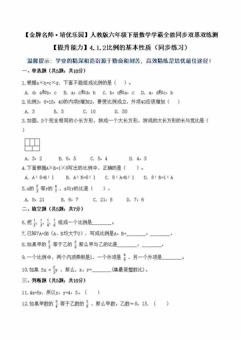 【提升能力】4.1.2比例的基本性质(同步练习)六年级下册数学学霸全能同步双基双练测 人教版(含答案)