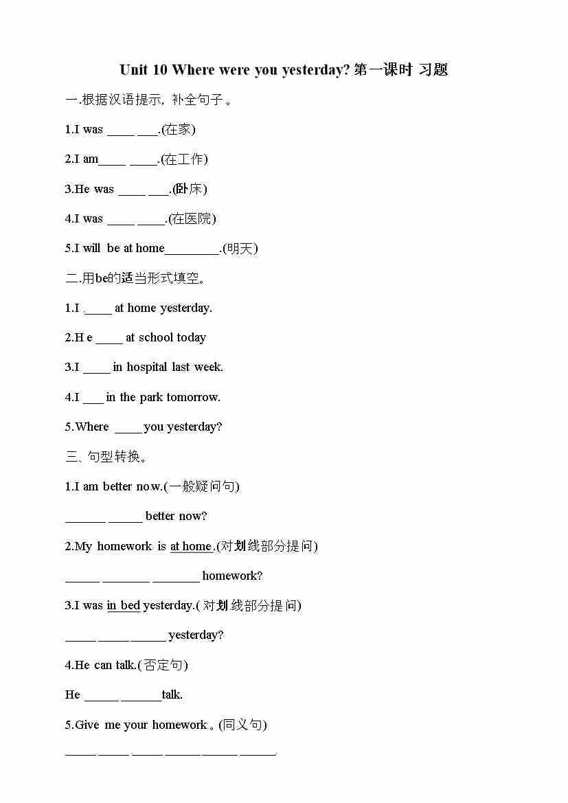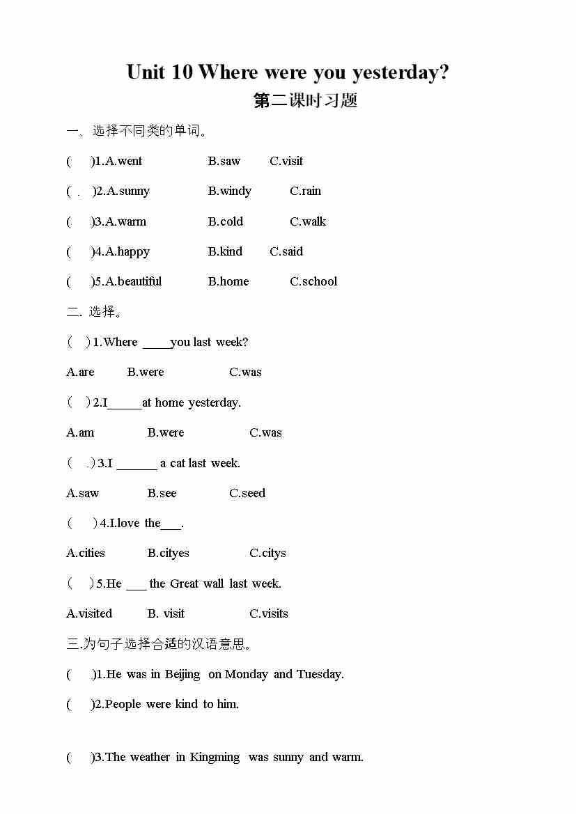 五年级下册英语一课一练-Unit 10 Where were you yesterday 第一课时 湘少版三起(word版,含答案)