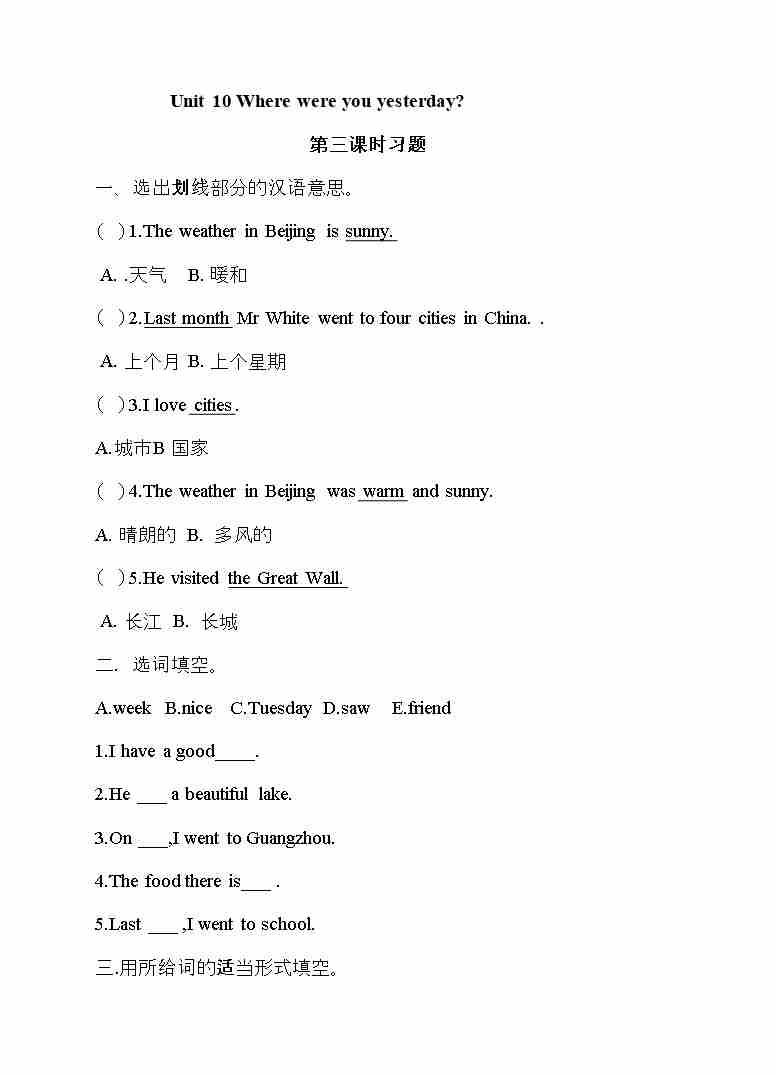 五年级下册英语一课一练-Unit 10 Where were you yesterday 第三课时 湘少版三起(word版,含答案)