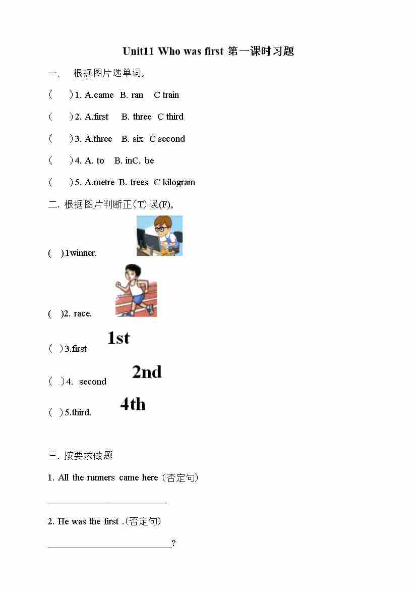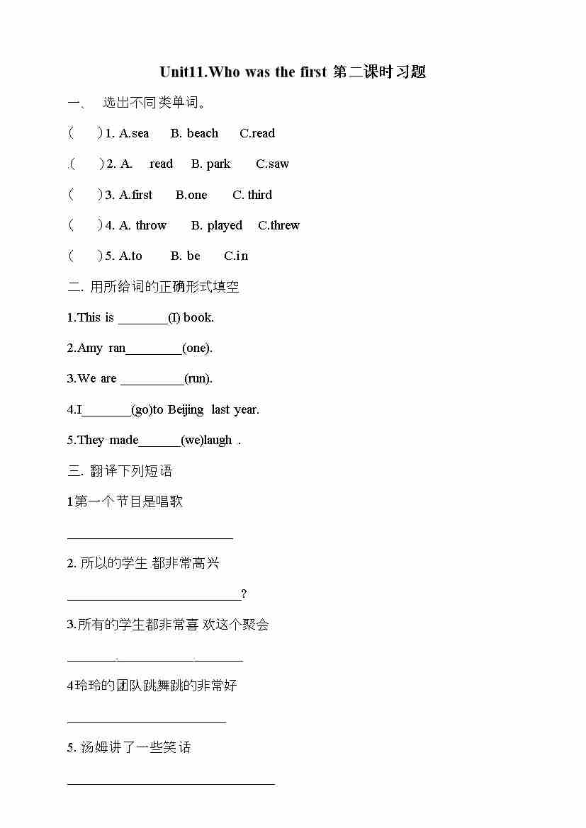 五年级下册英语一课一练-Unit 11 Who was fast 第二课时 湘少版三起(word版,含答案)