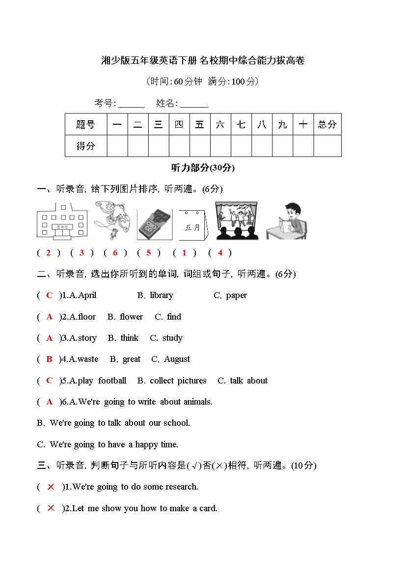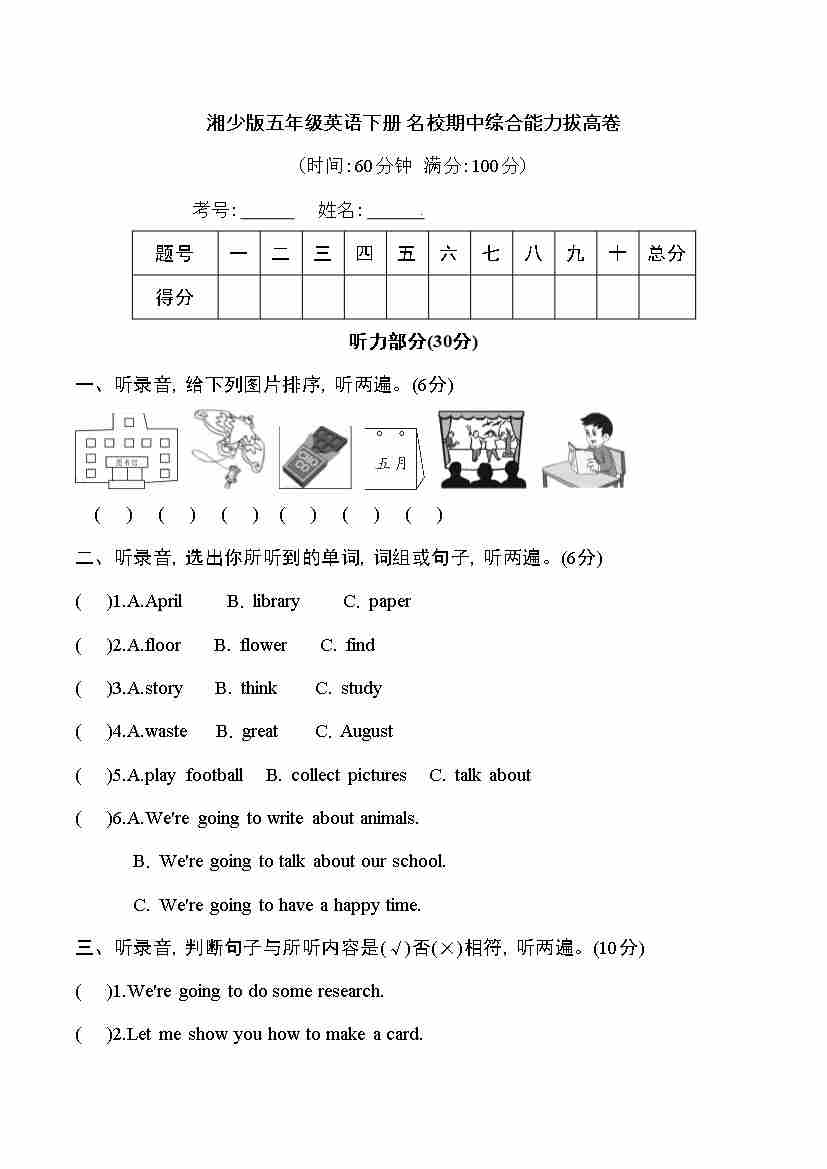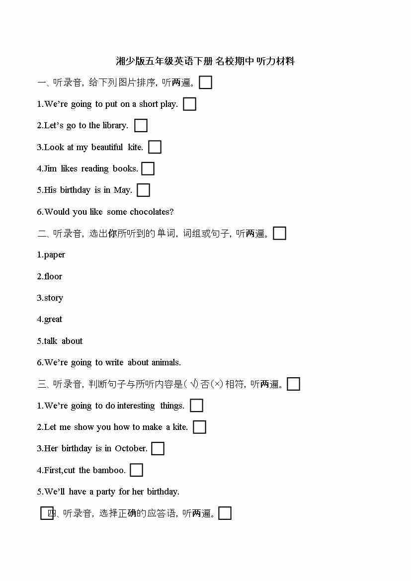 湘少版五年级英语下册名校期中听力材料