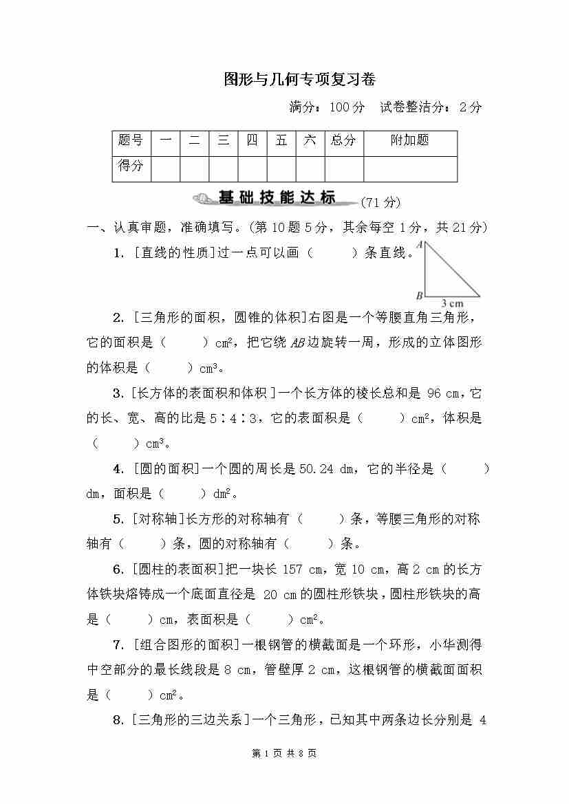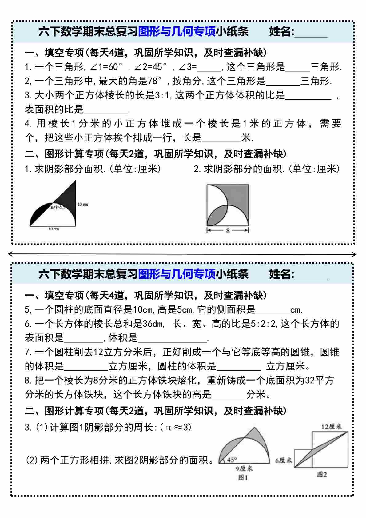 六(下)数学期末总复习图形与几何专项小纸条(附带答案)