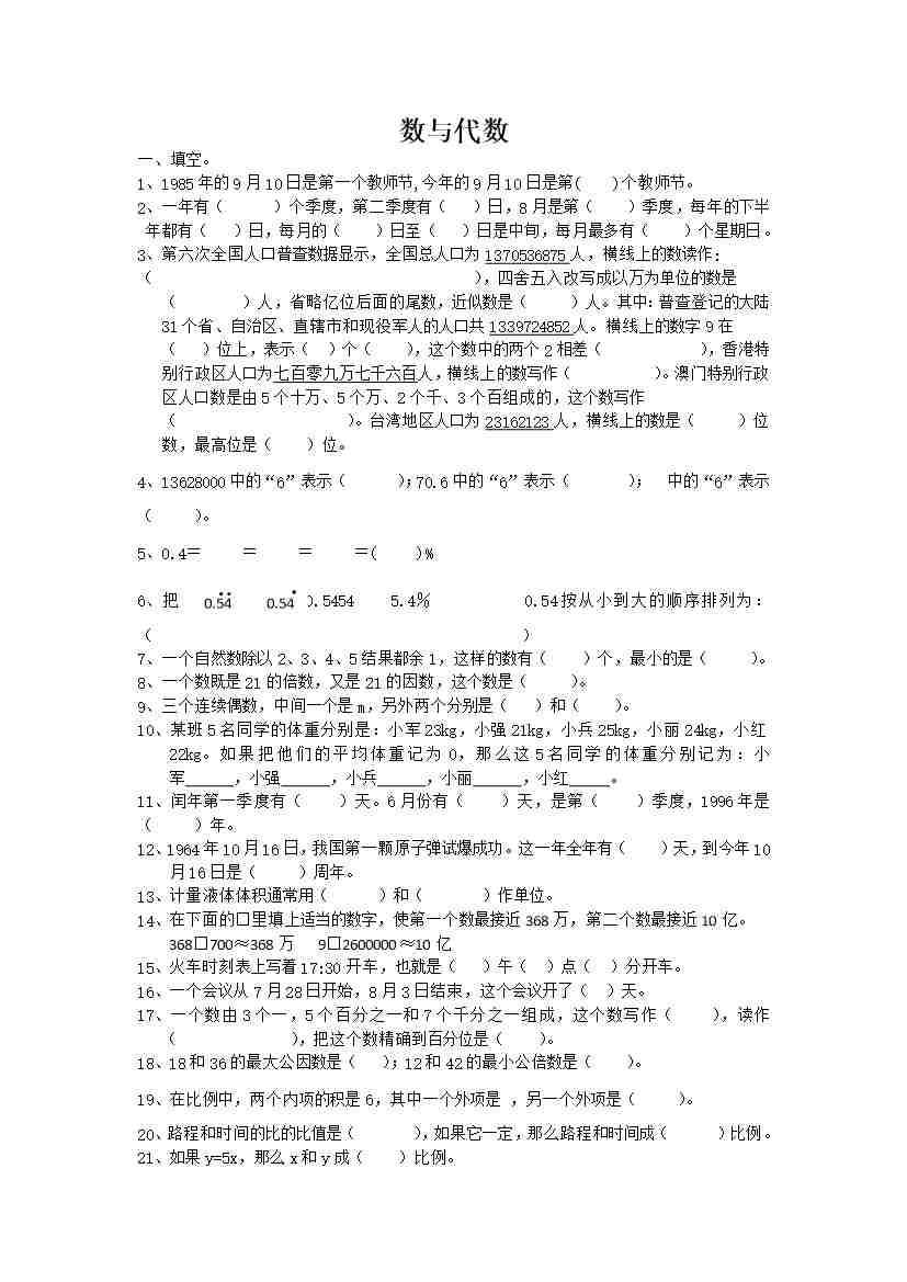 六下数学【总复习专题:数与代数 含答案 13页】