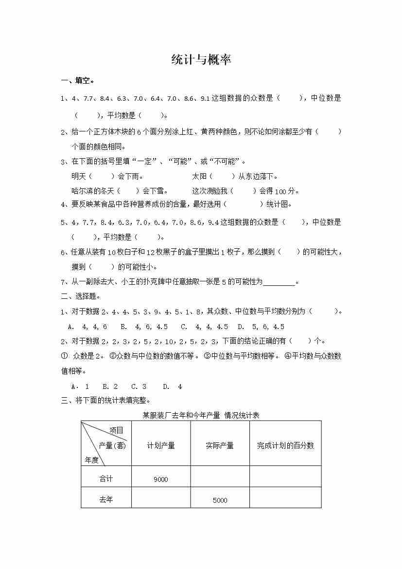 六下数学【总复习专题:统计与概率 含答案 5页】