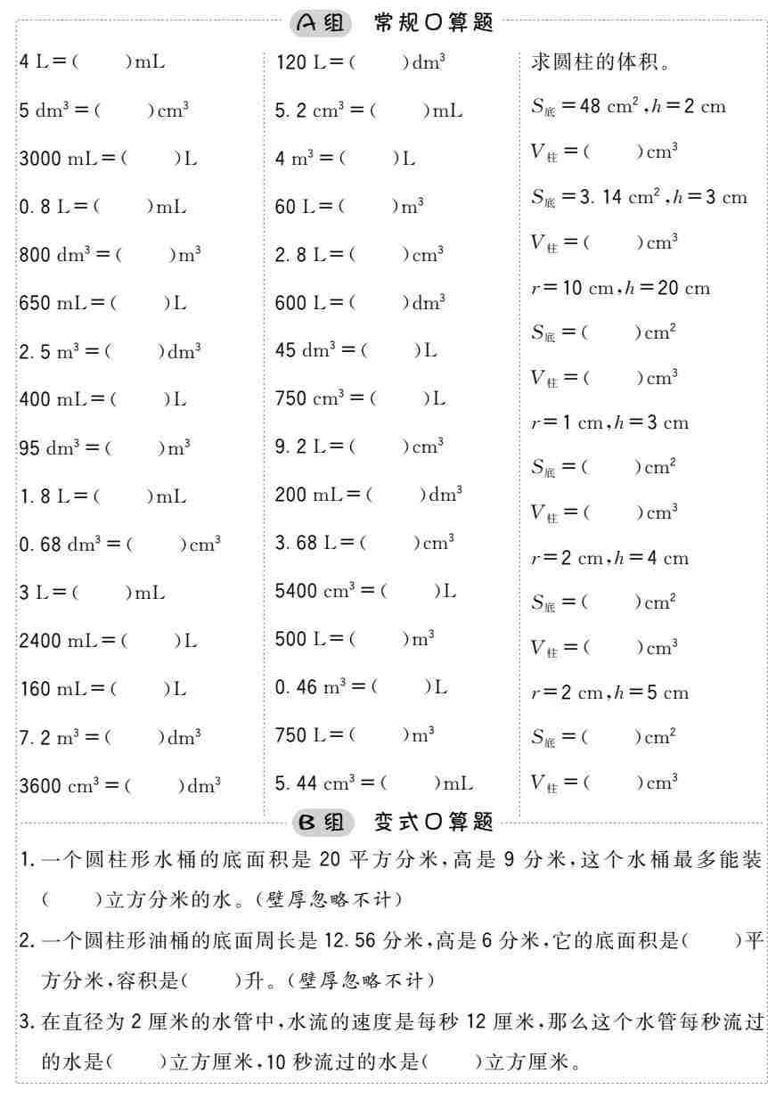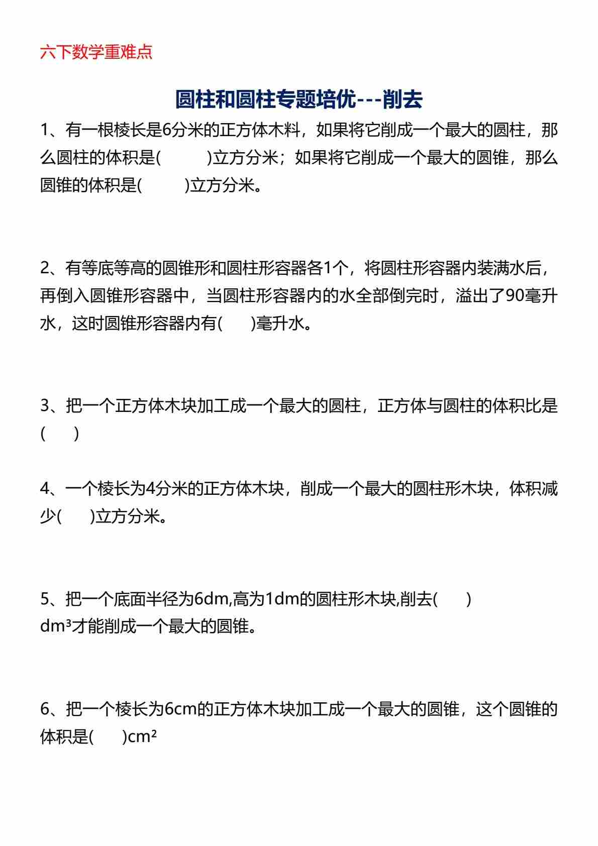 六(下)数学圆柱圆锥应用题题和答案