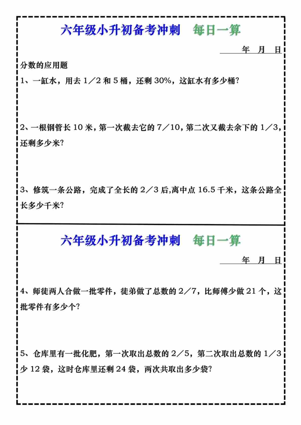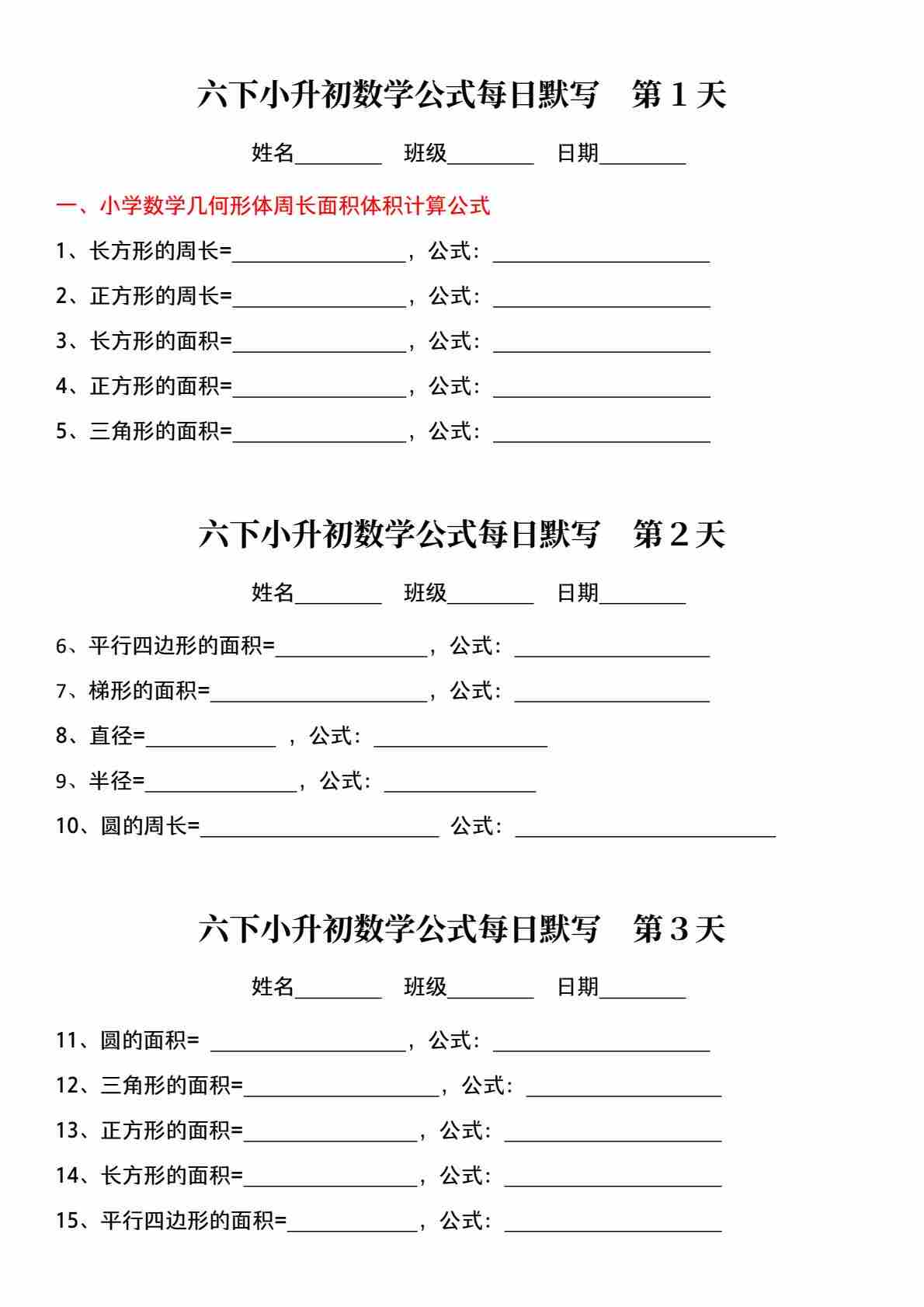 六(下)数学小升初公式每日默写(空白)