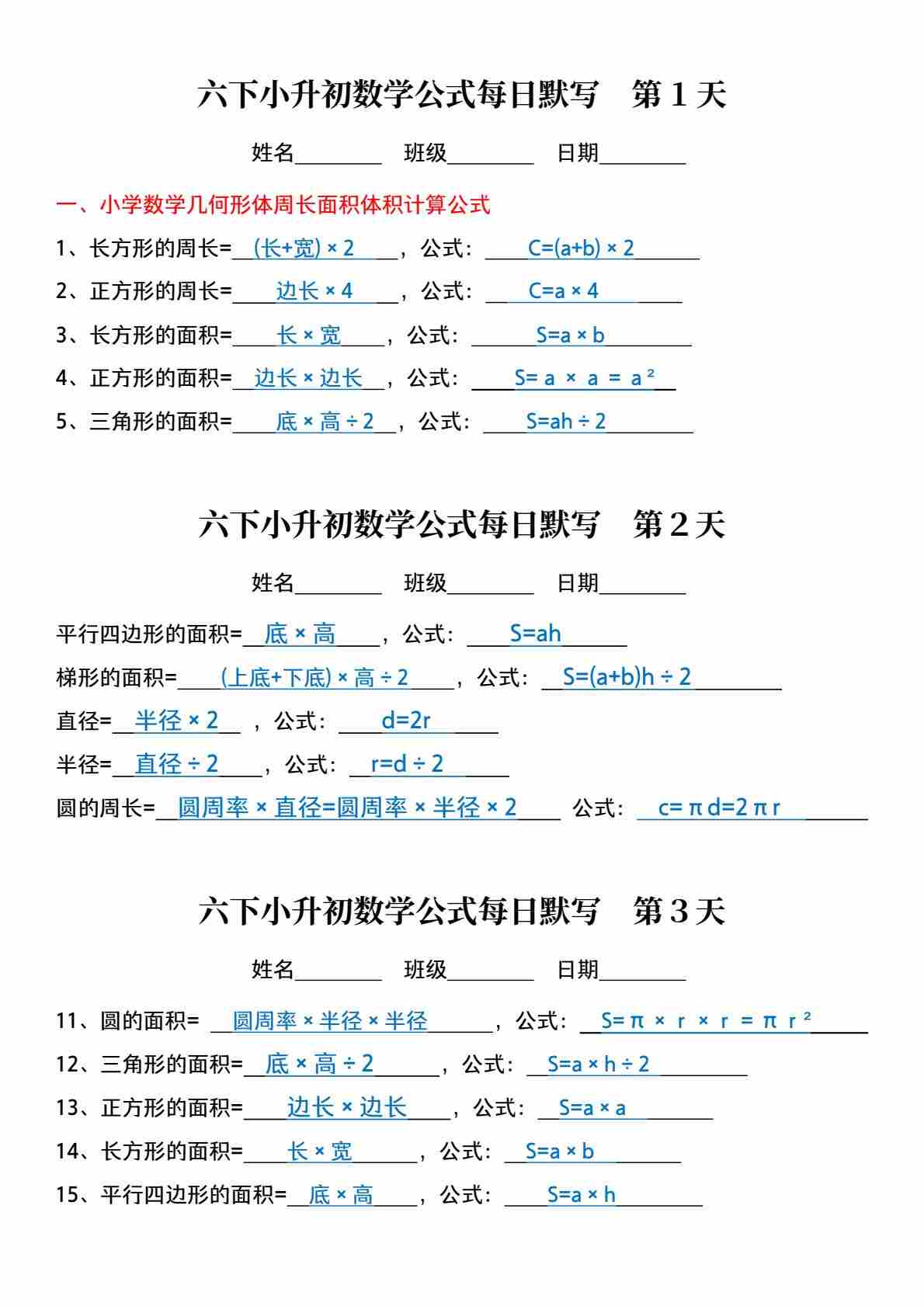 六(下)数学小升初公式每日默写(答案)