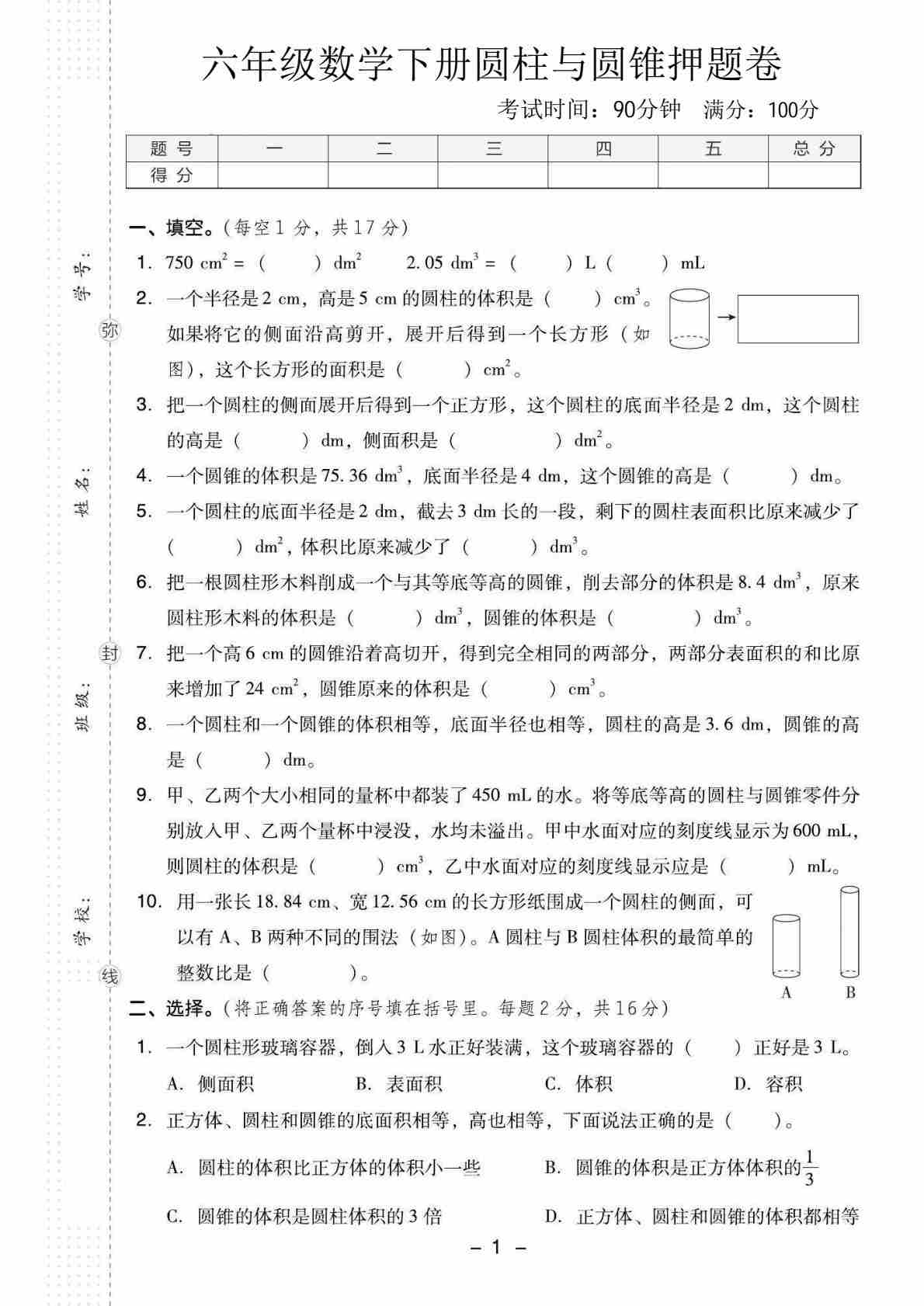 六 (下) 数学【圆柱与圆锥押题卷】