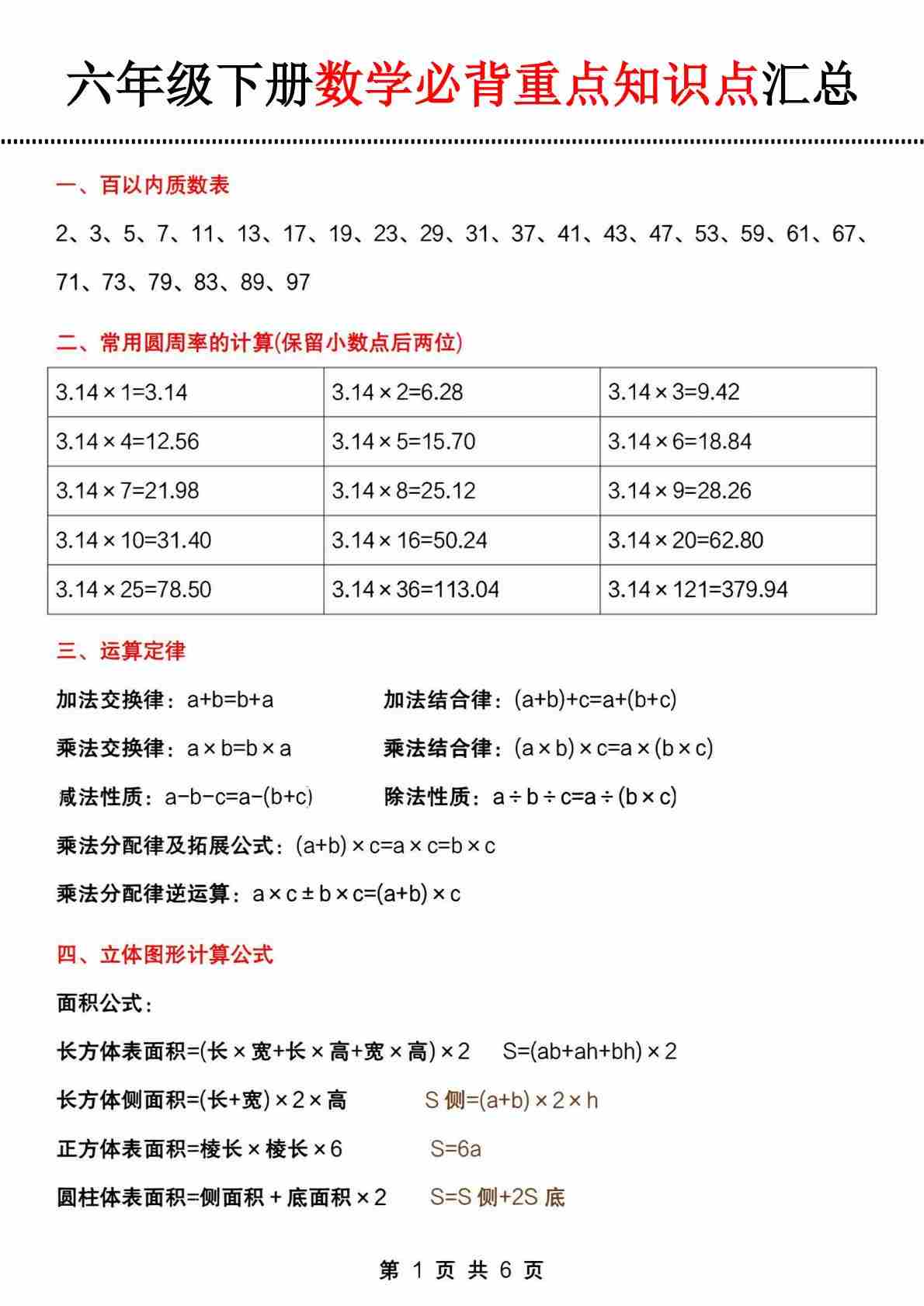 六(下)数学知识点梳理表格