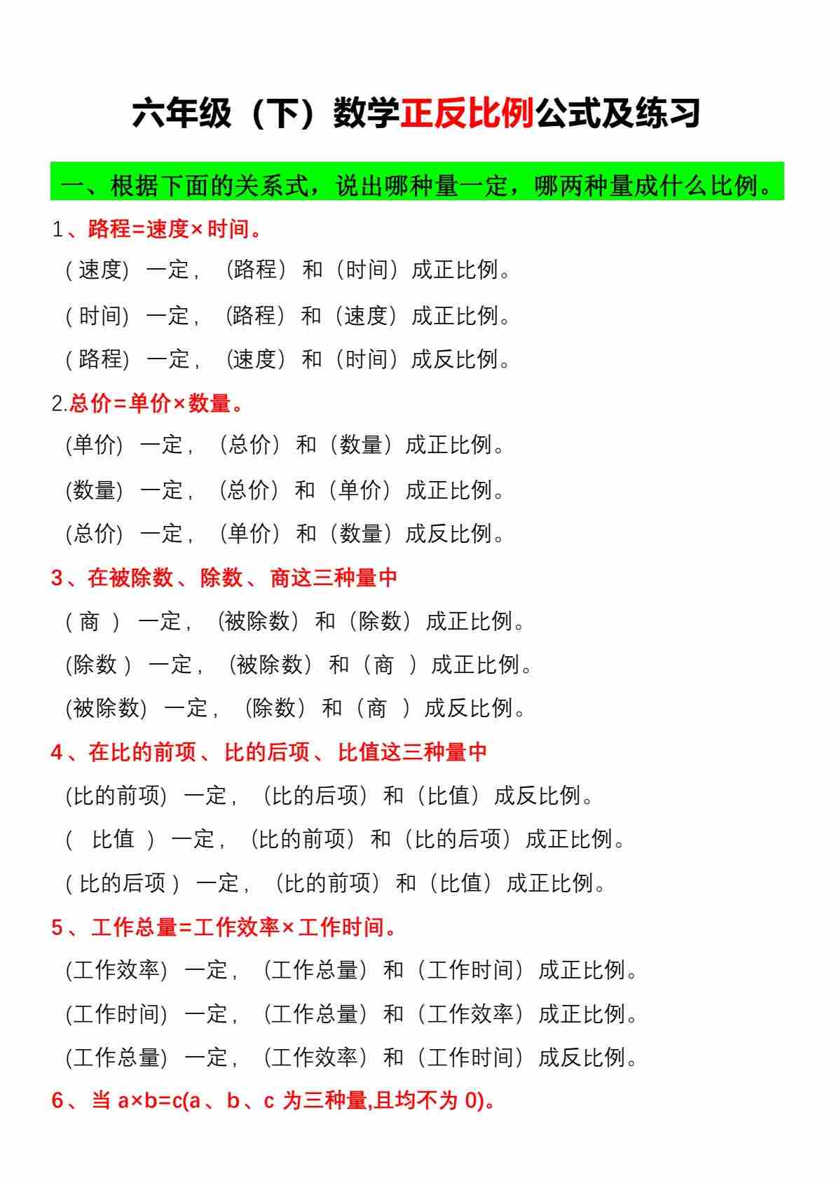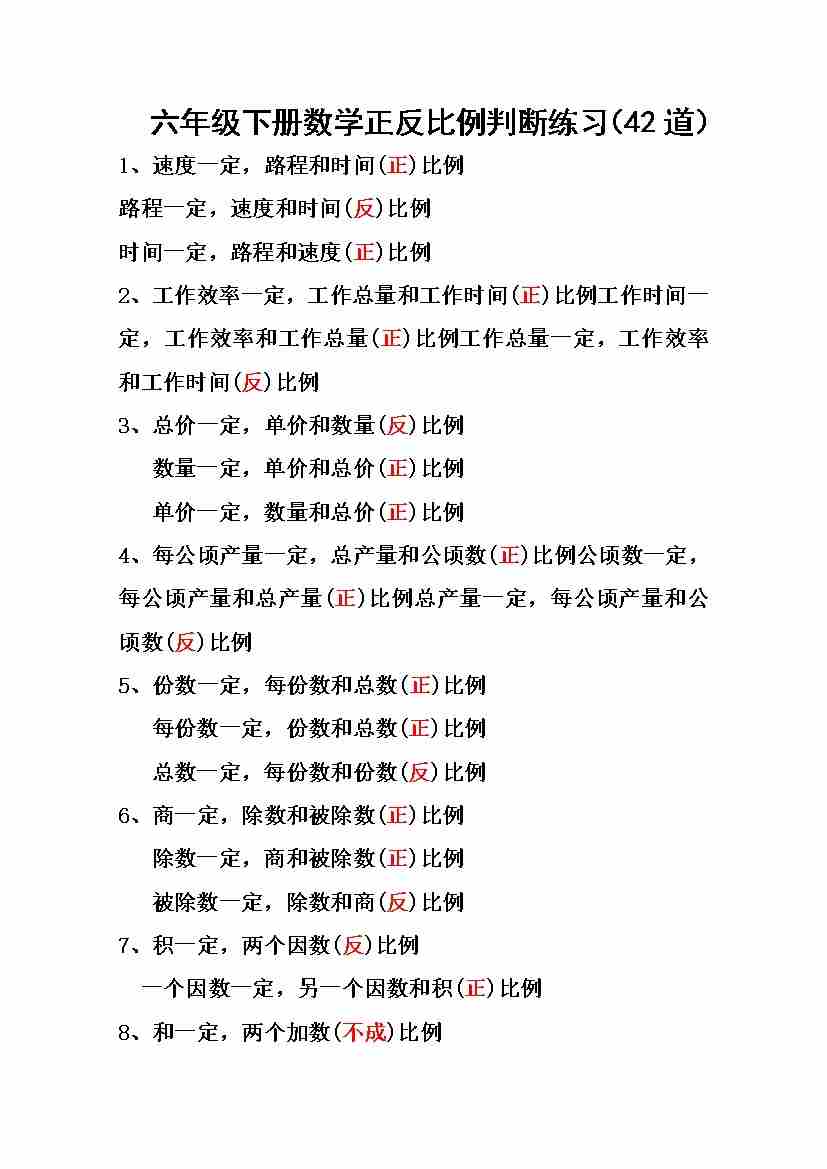六(下)数学正反比例公式归纳总结