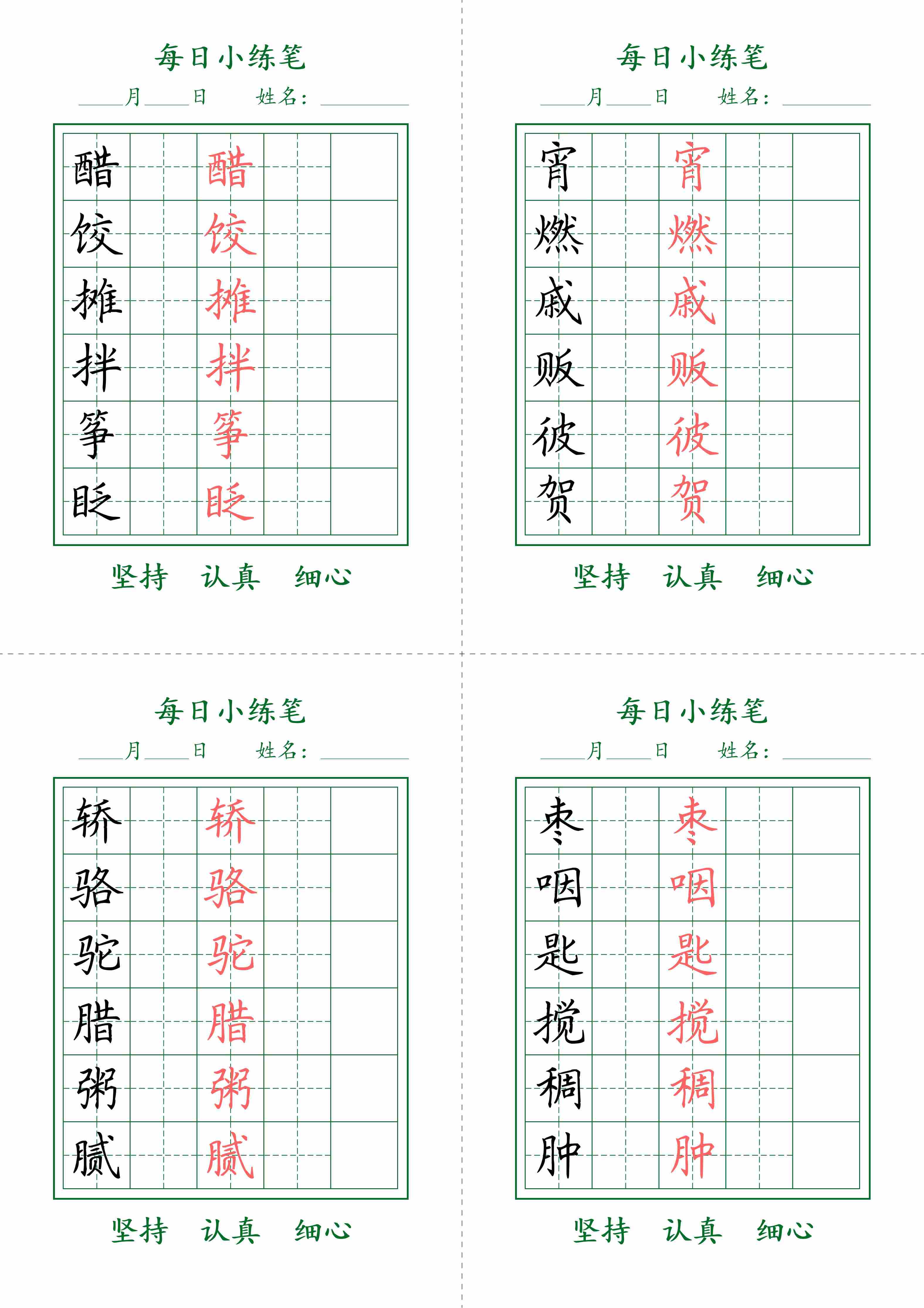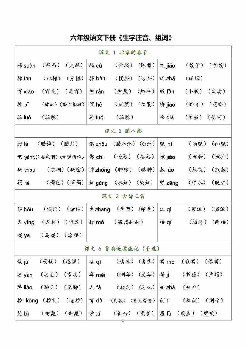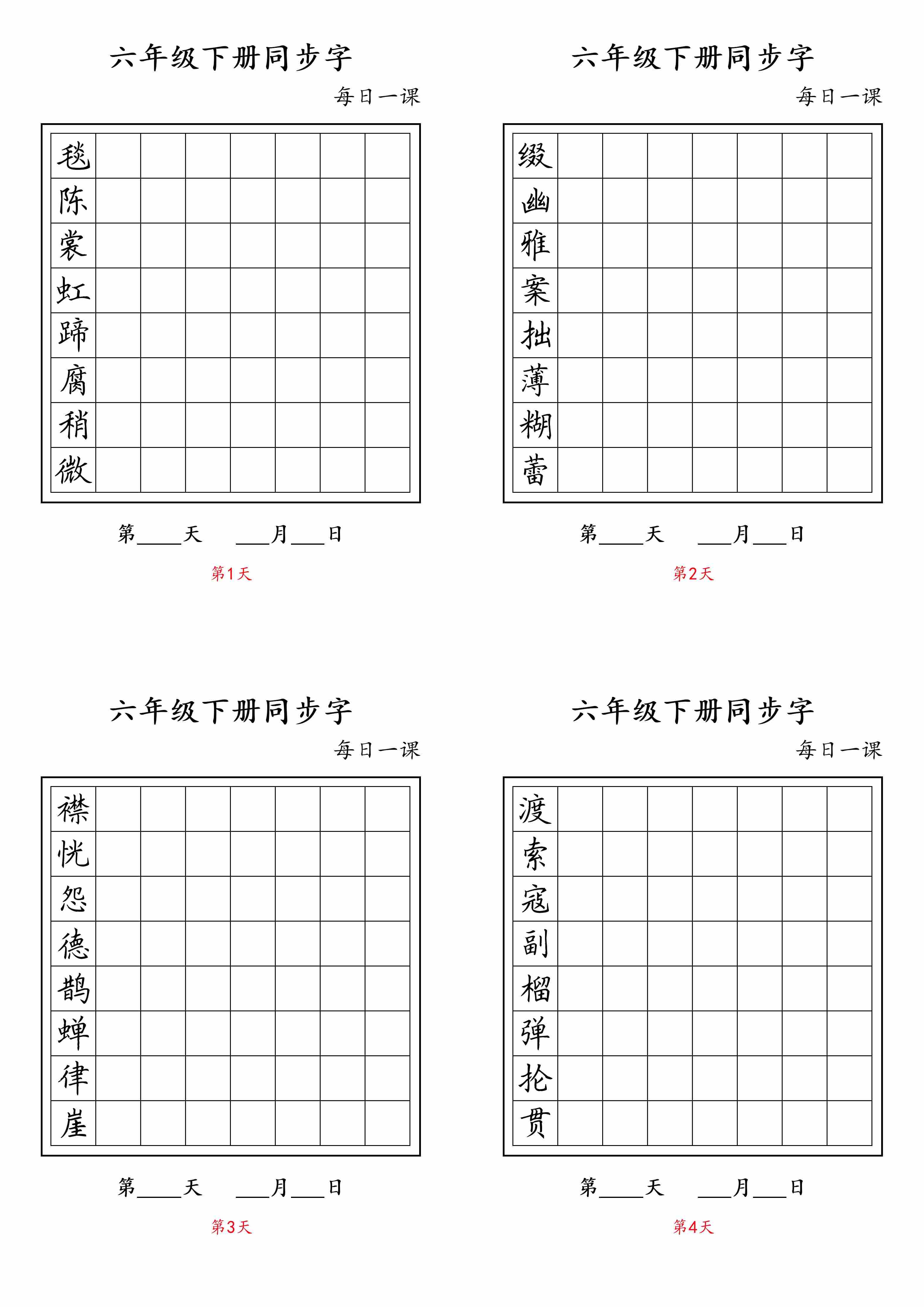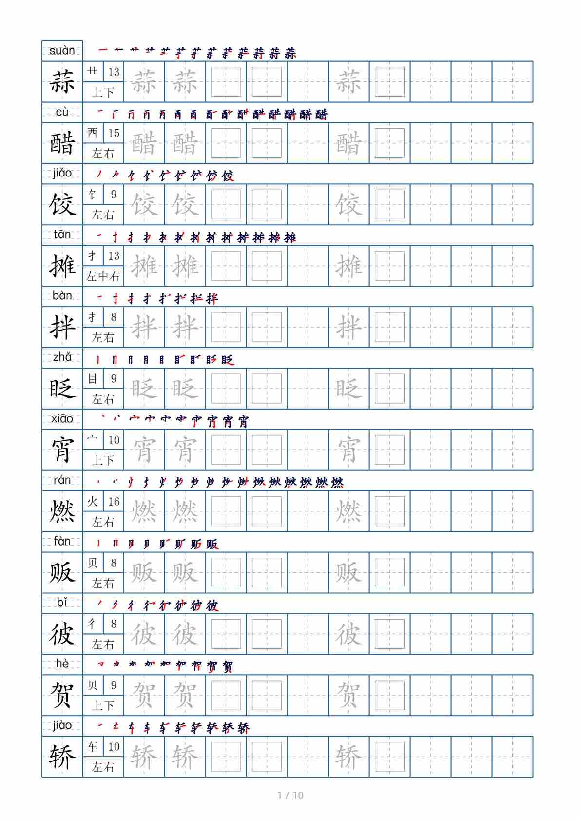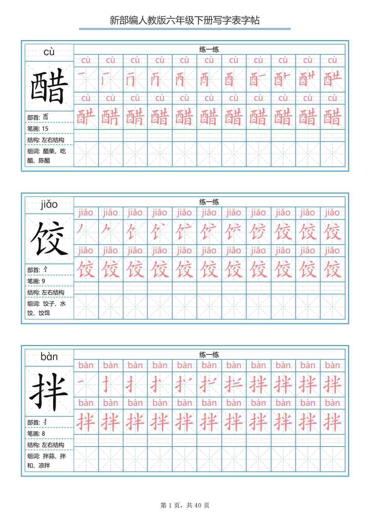 六(下)语文生字表120个,字帖10页(偏旁部首 笔顺 拼音)