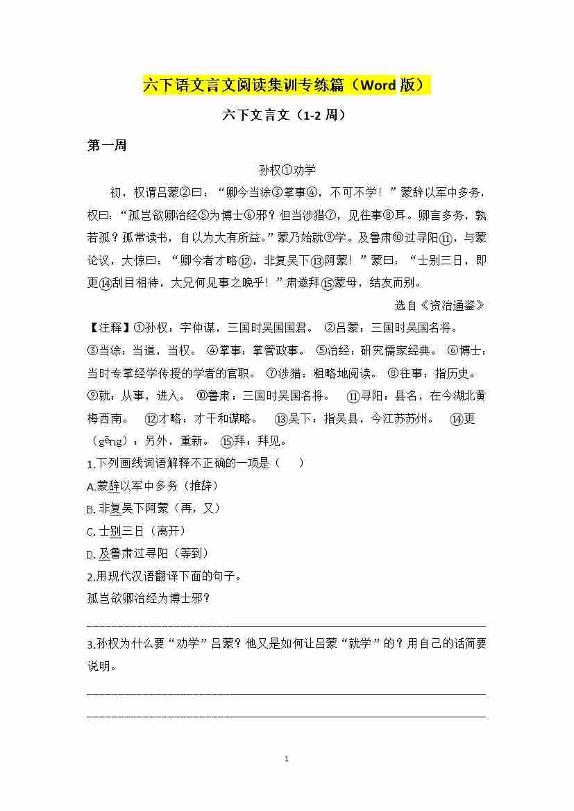 六(下)语文言文阅读集训专练篇(Word版1-7周突破训练)