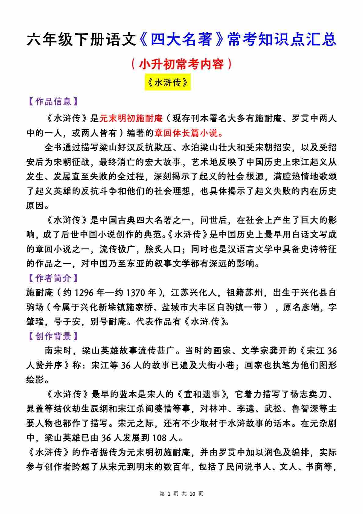 六(下)语文【课外四大名著阅读-水浒传真题讲解】
