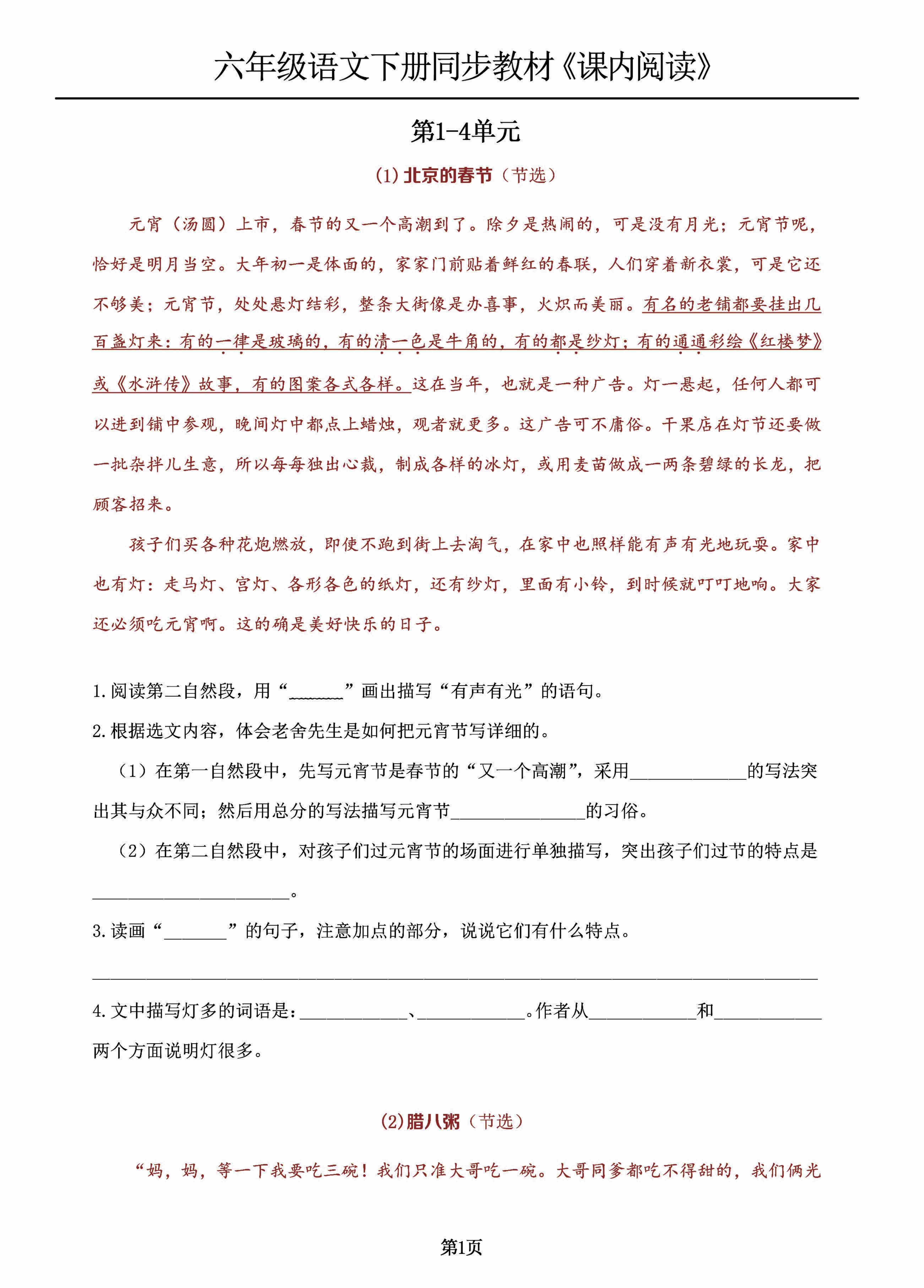 六(下)语文同步教材《课内阅读》,专项练习(第1-4单元)