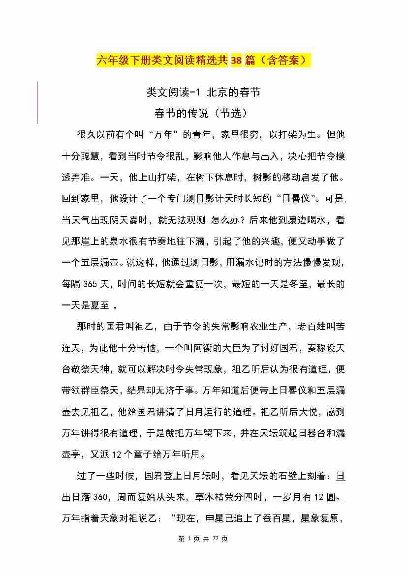 六(下)语文类文阅读精选共38篇(含答案)