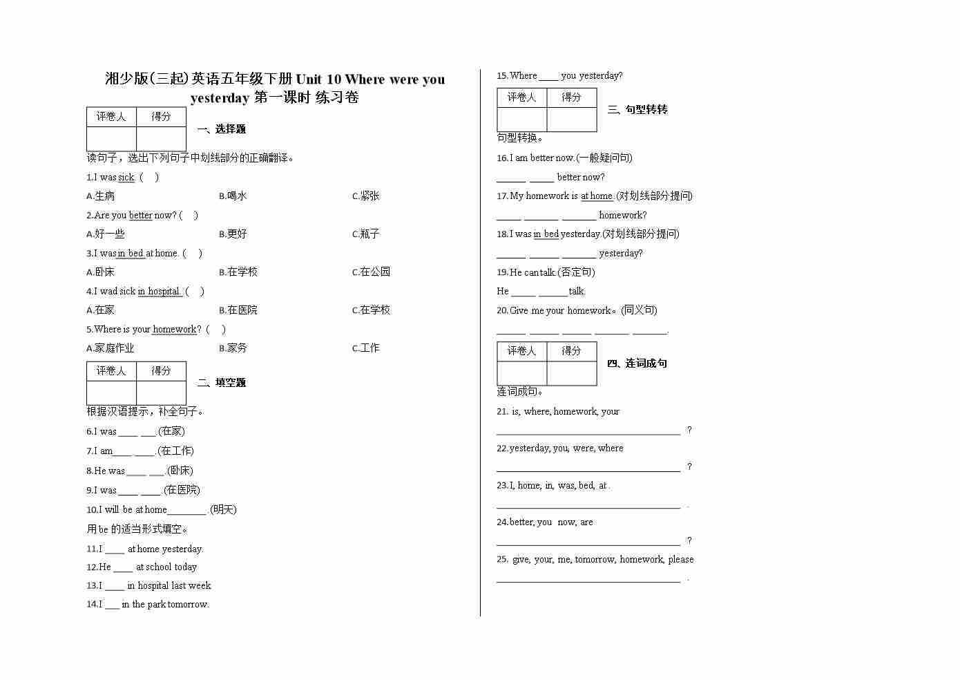 五年级下册Unit 10 Where were you yesterday 第一课时 练习卷及答案-湘少版(三起)英语