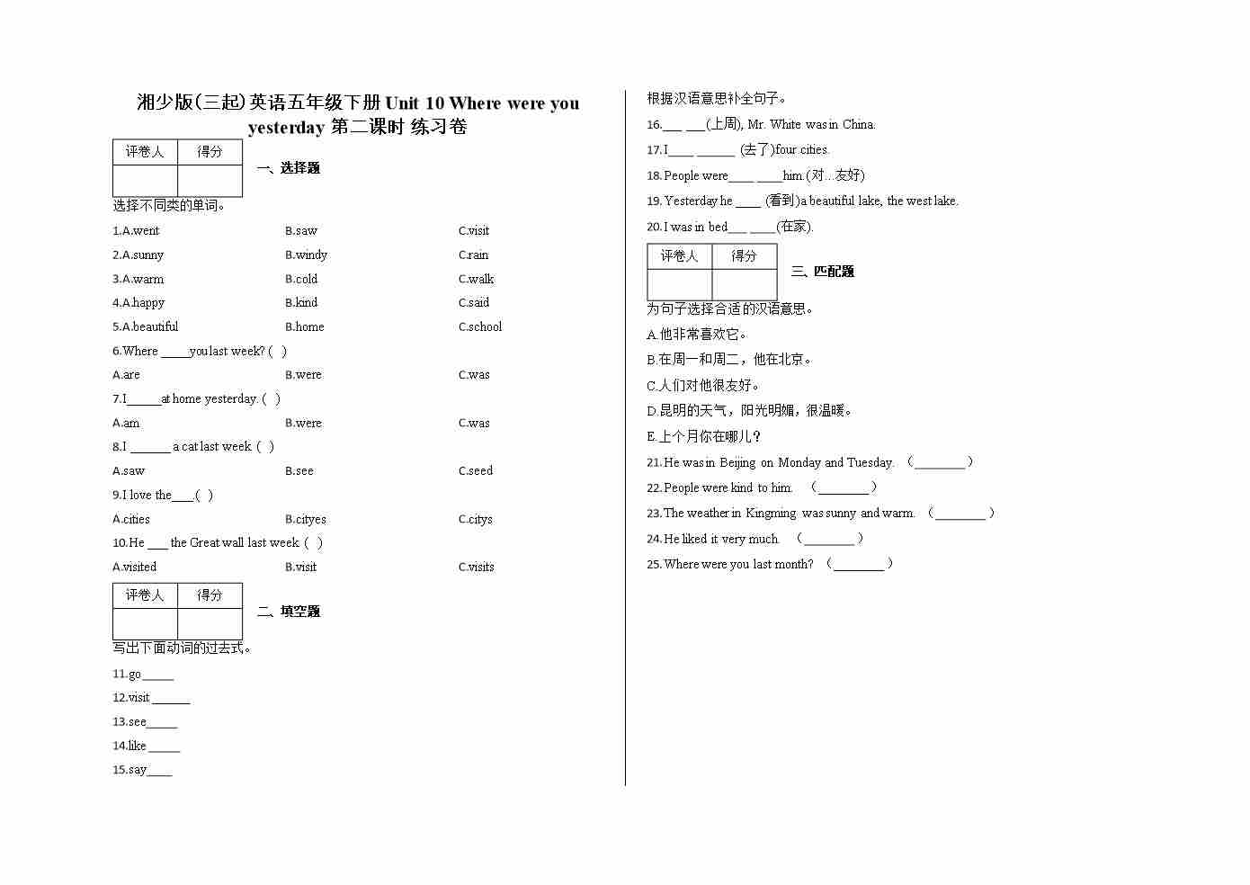 五年级下册Unit 10 Where were you yesterday 第二课时 练习卷及答案-湘少版(三起)英语
