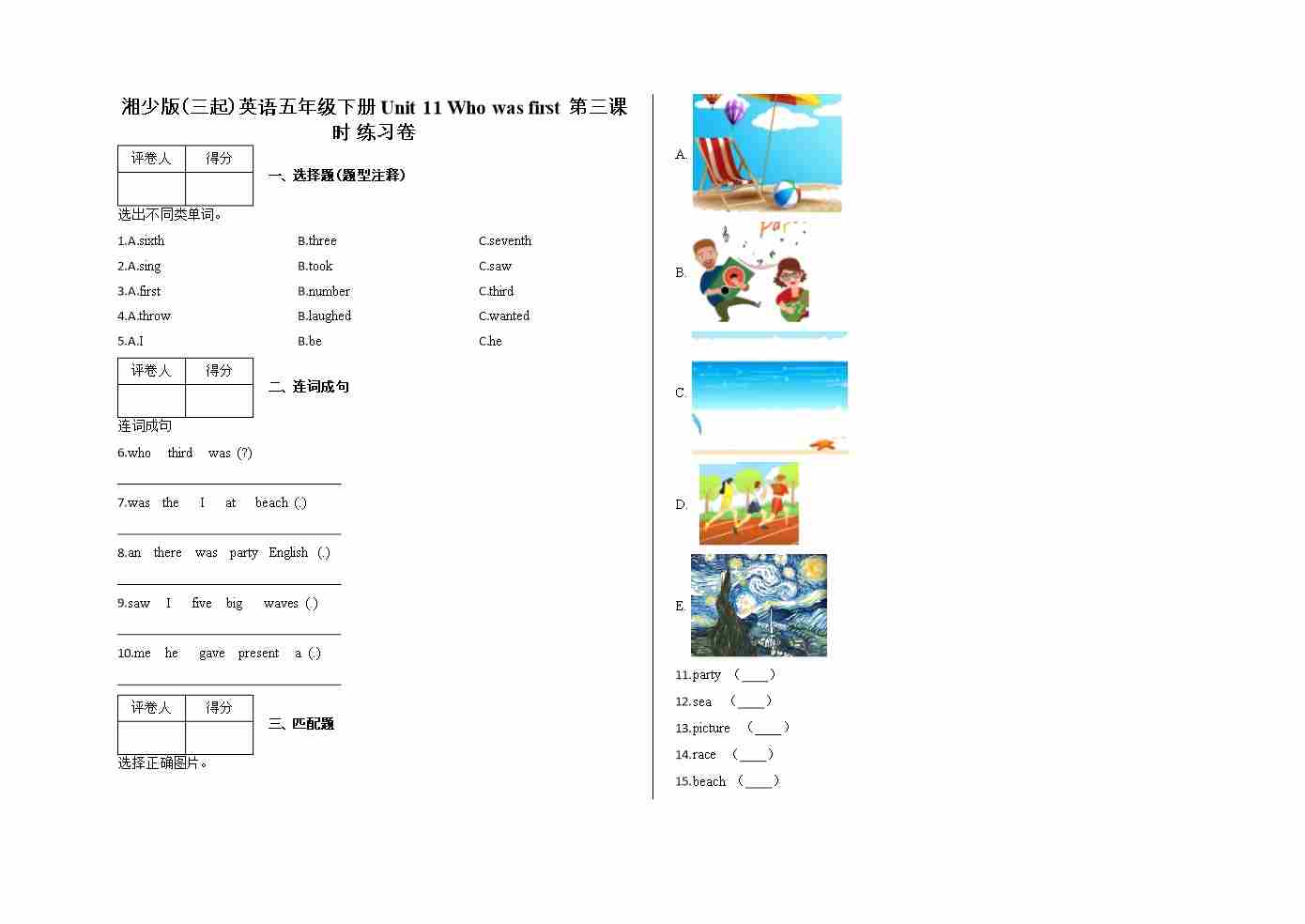 五年级下册Unit 11 Who was first 第三课时 练习卷及答案-湘少版(三起)英语