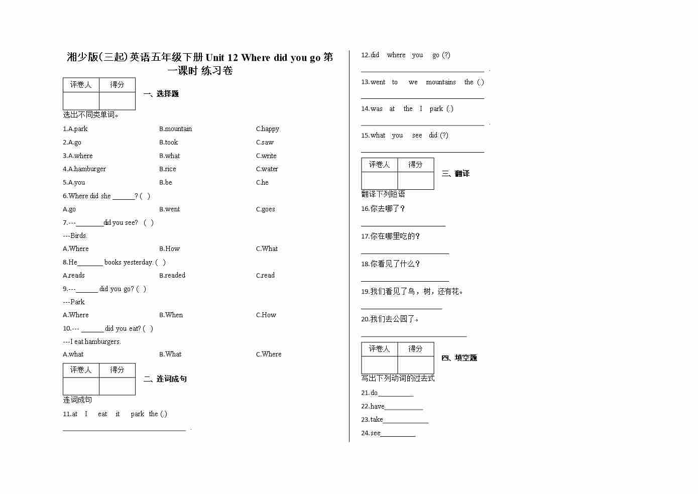 五年级下册Unit 12 Where did you go 第一课时 练习卷及答案-湘少版(三起)英语
