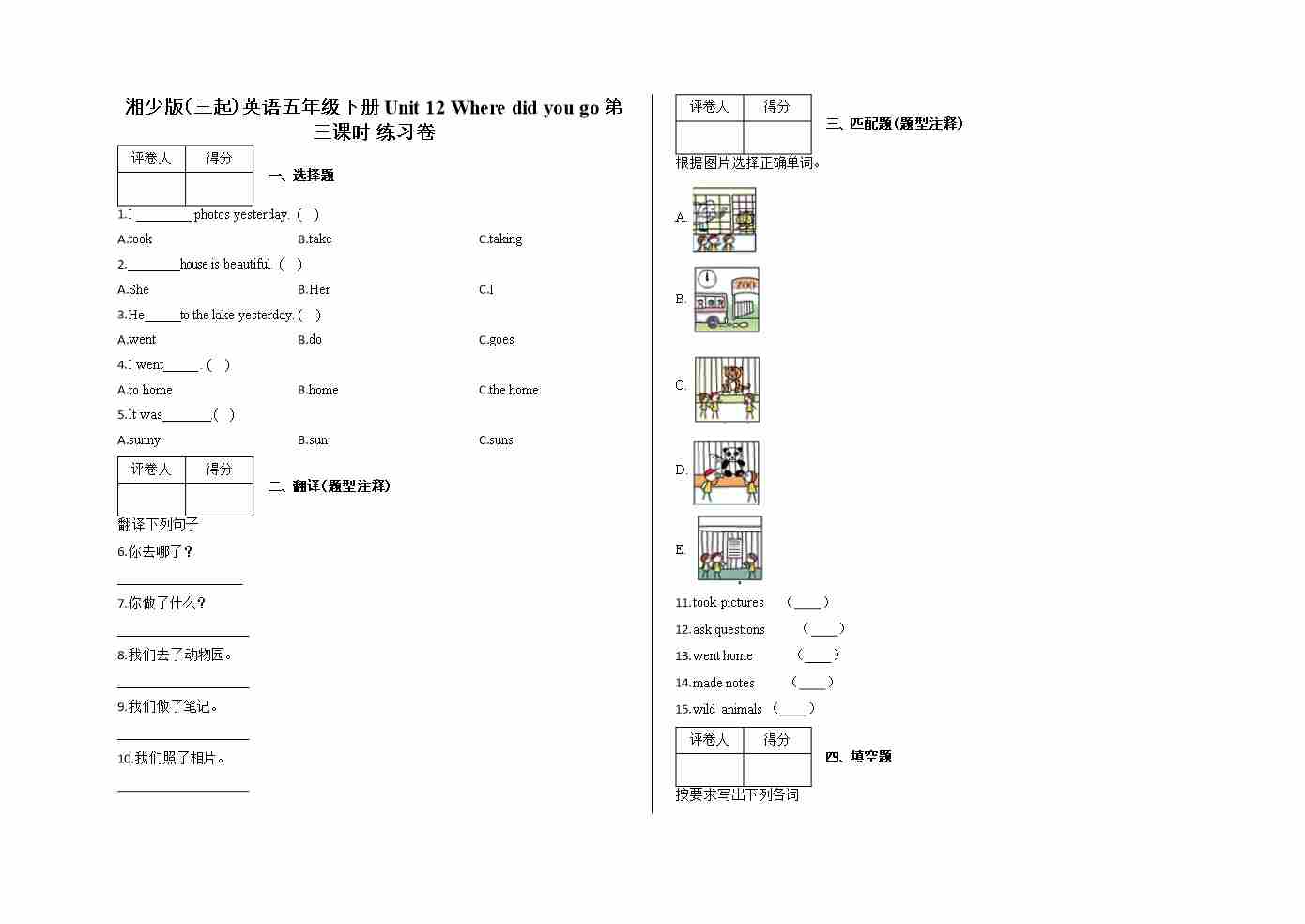 五年级下册Unit 12 Where did you go 第三课时 练习卷及答案-湘少版(三起)英语