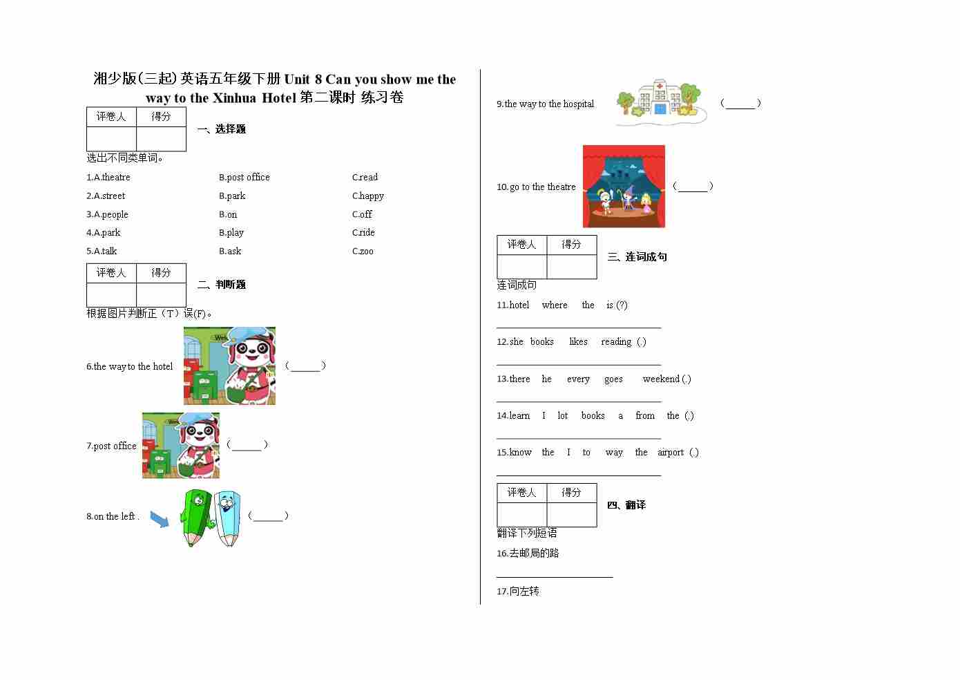 五年级下册Unit 8 Can you show me the way to the Xinhua Hotel 第二课时 练习卷及答案-湘少版(三起)英语
