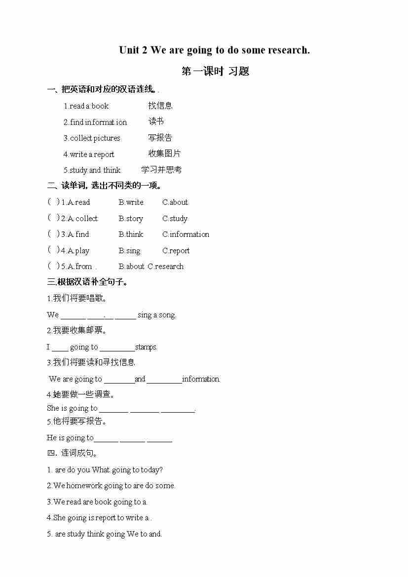 五年级下册英语一课一练- Unit 2 We are going to do some research 第一课时 湘少版(三起)(word 版,含答案)