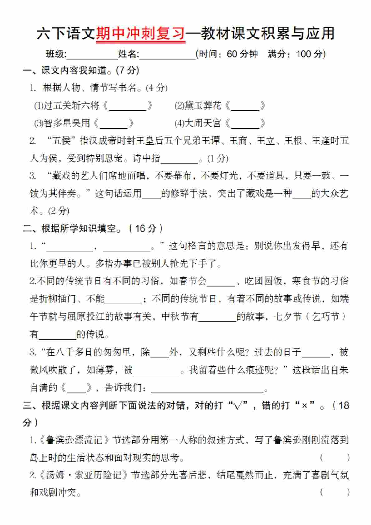 【期中复习默写表】六下语文