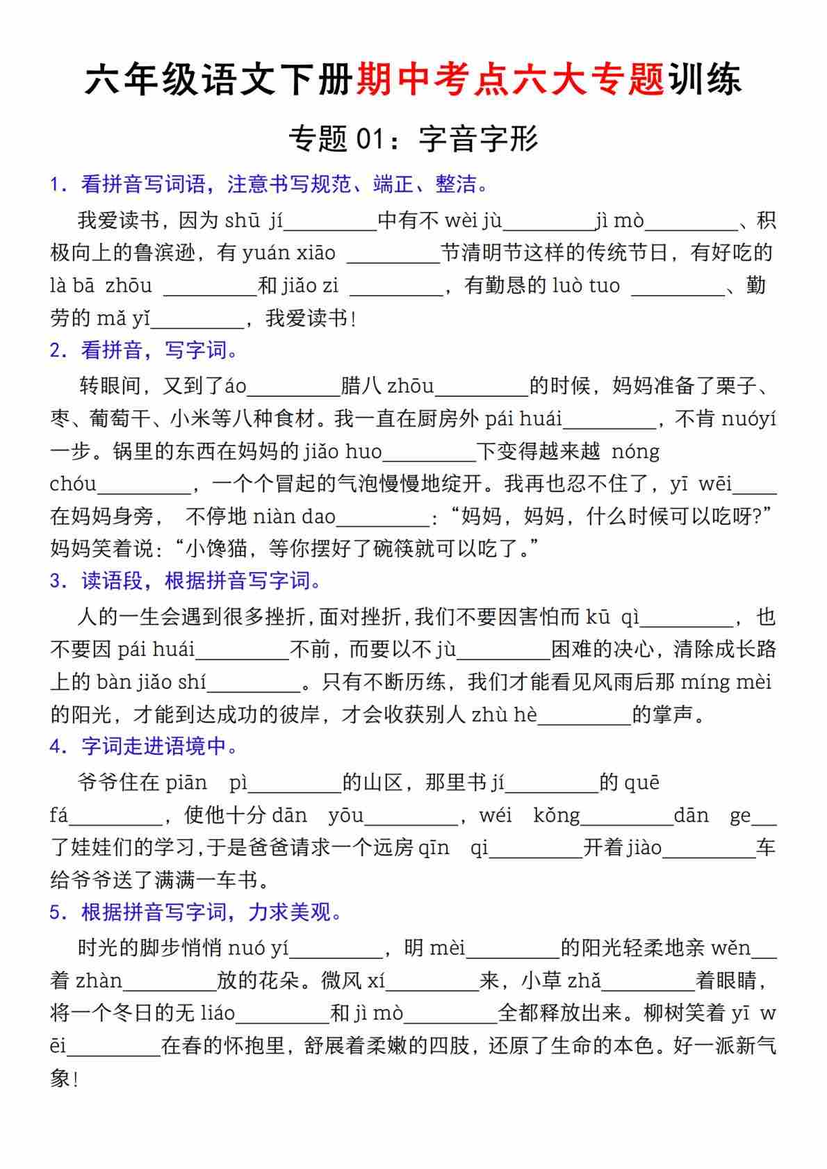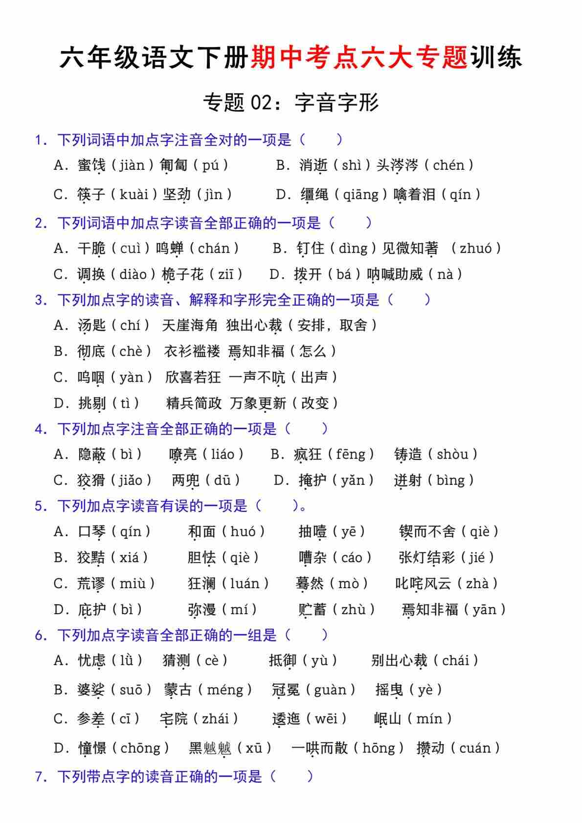 【期中复习专题02:字音字形】六下语文