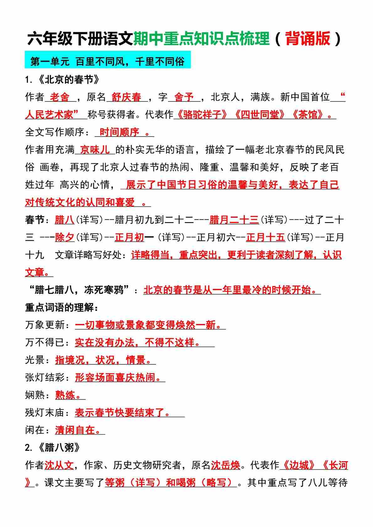 【期中复习重点知识点梳理】六下语文