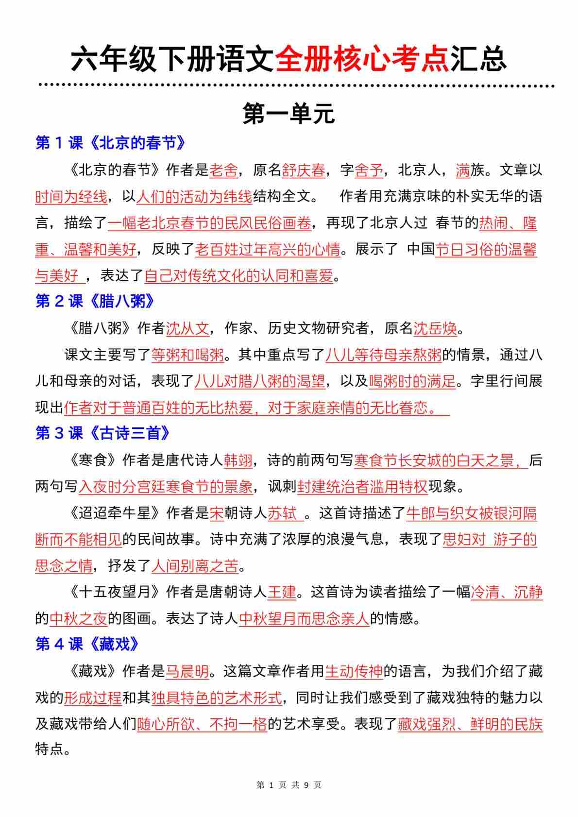【期末全册核心考点归纳汇总】六下语文