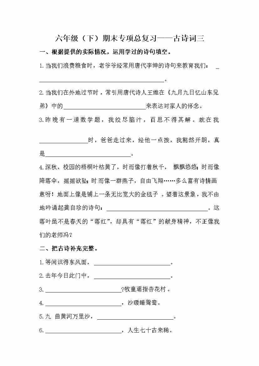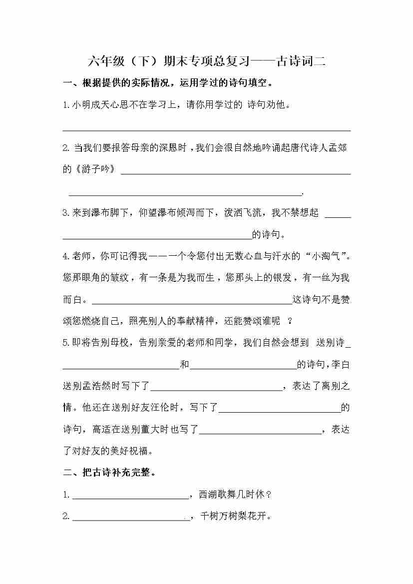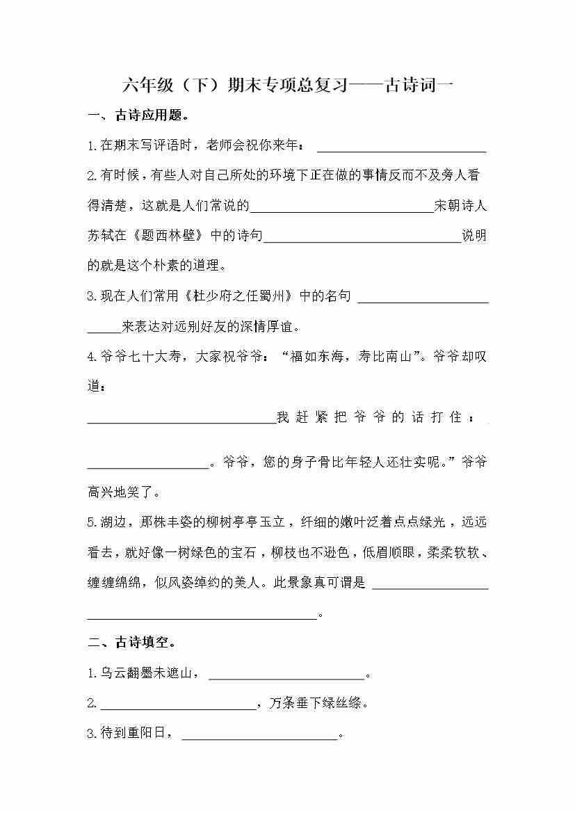 【期末复习:古诗词专项训练(二)(含答案)】六下语文