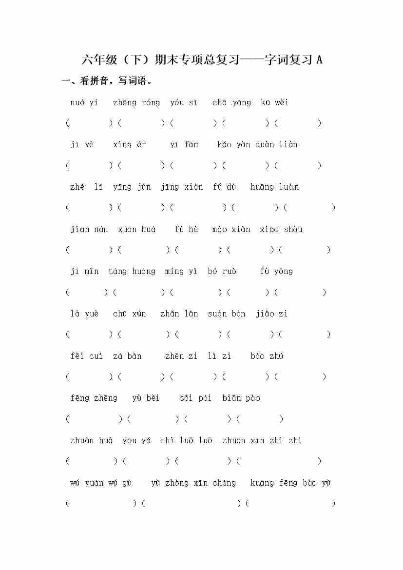 【期末类型题复习 字词复习A(含答案)】六下语文