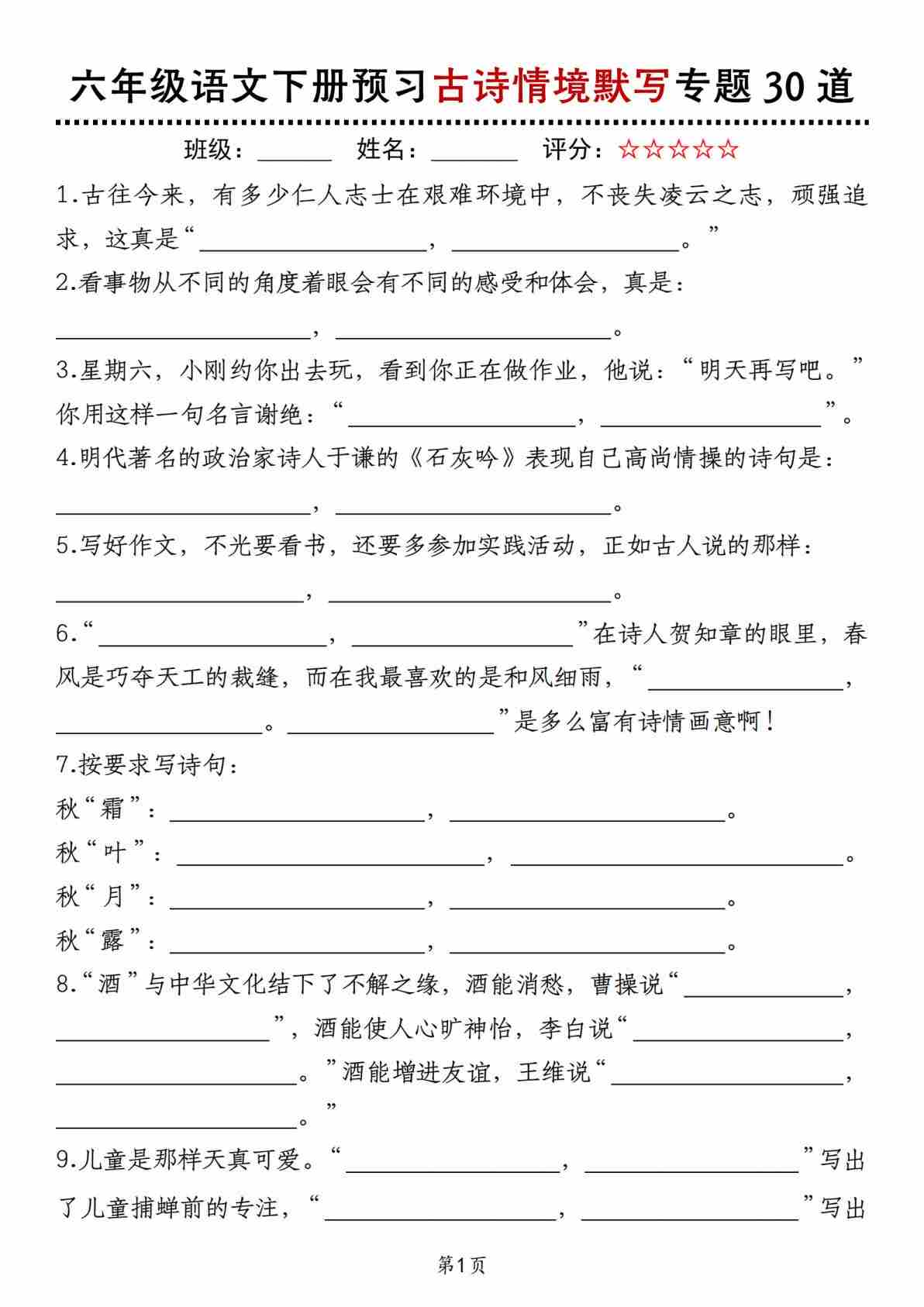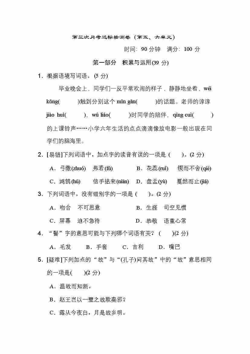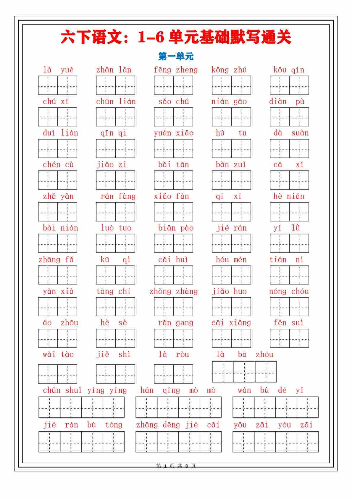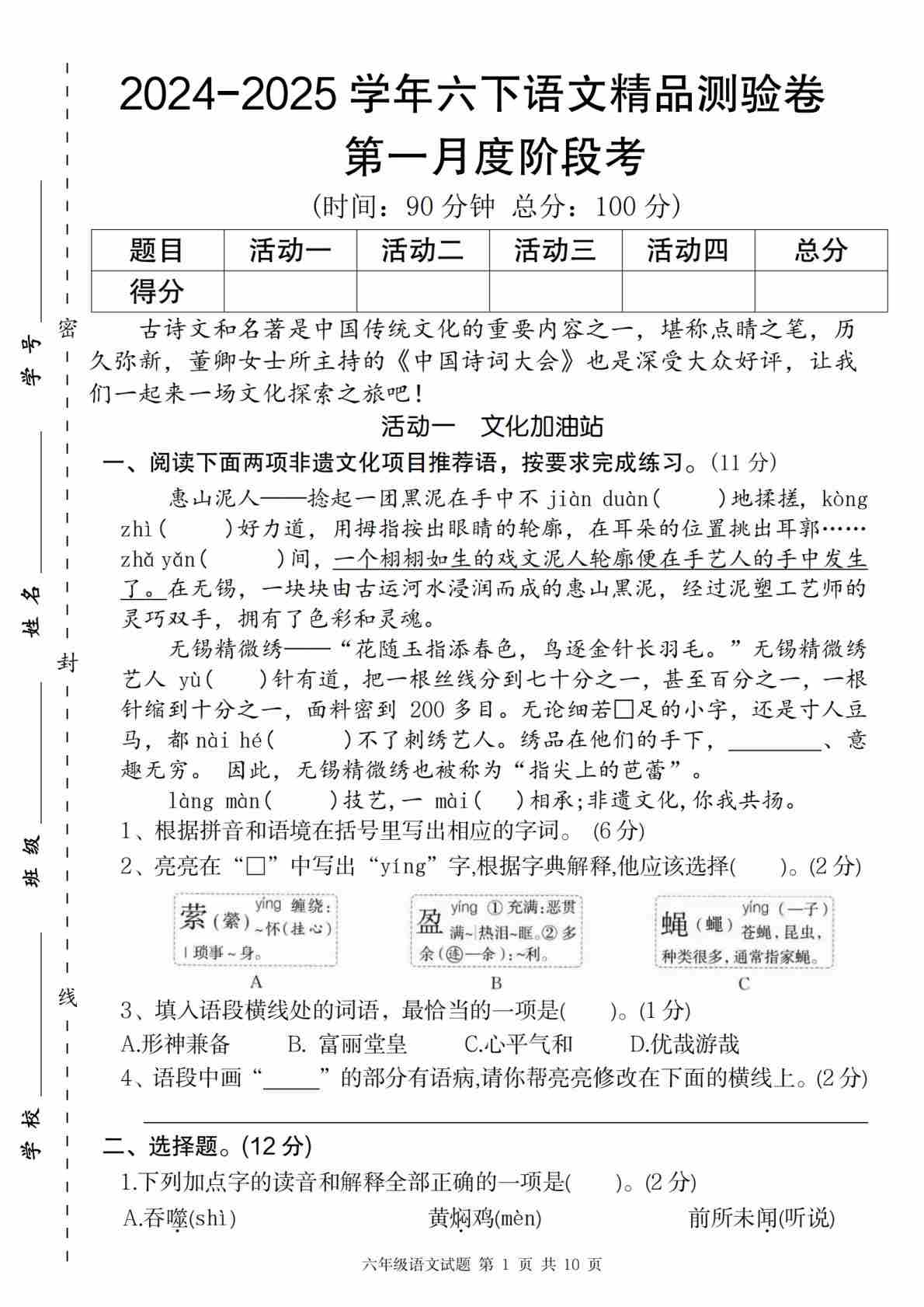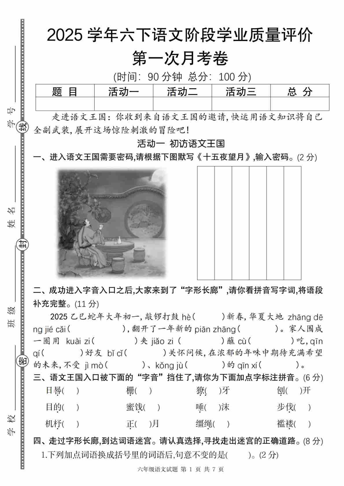 【2025学年第一次月考阶段学业质量评价卷】六下语文