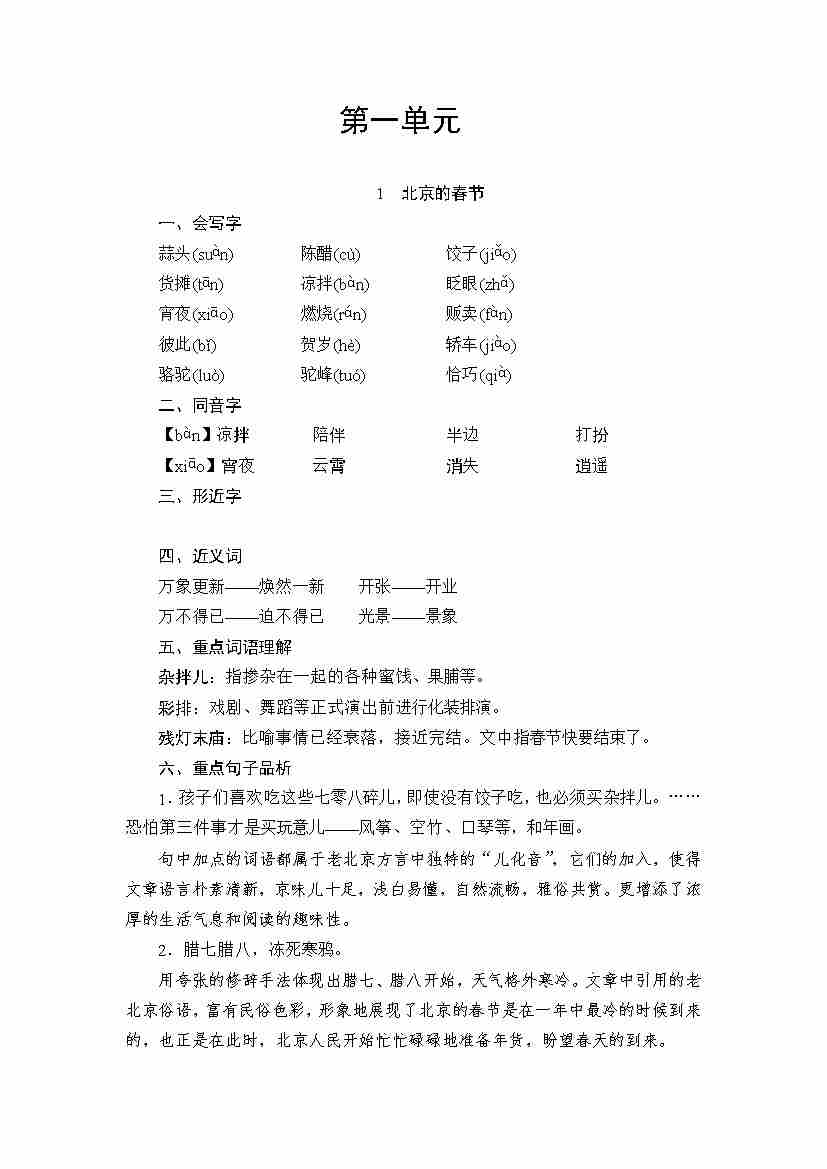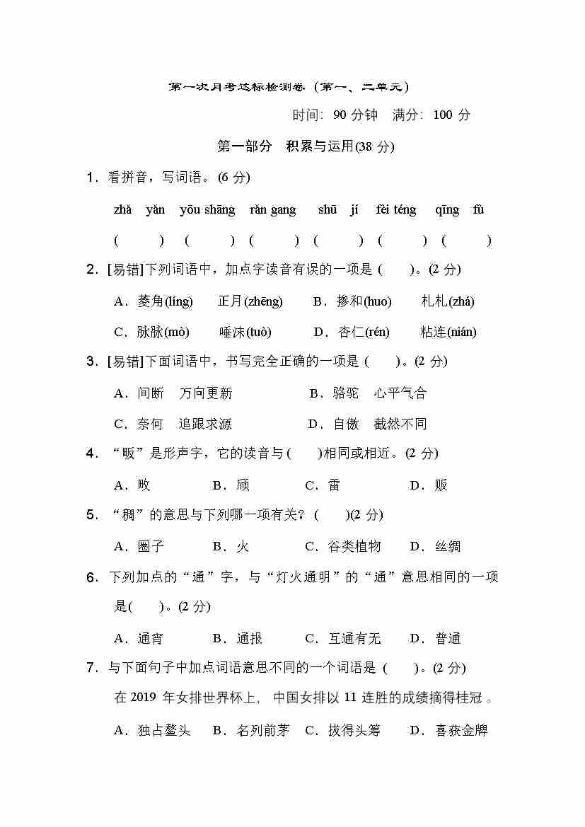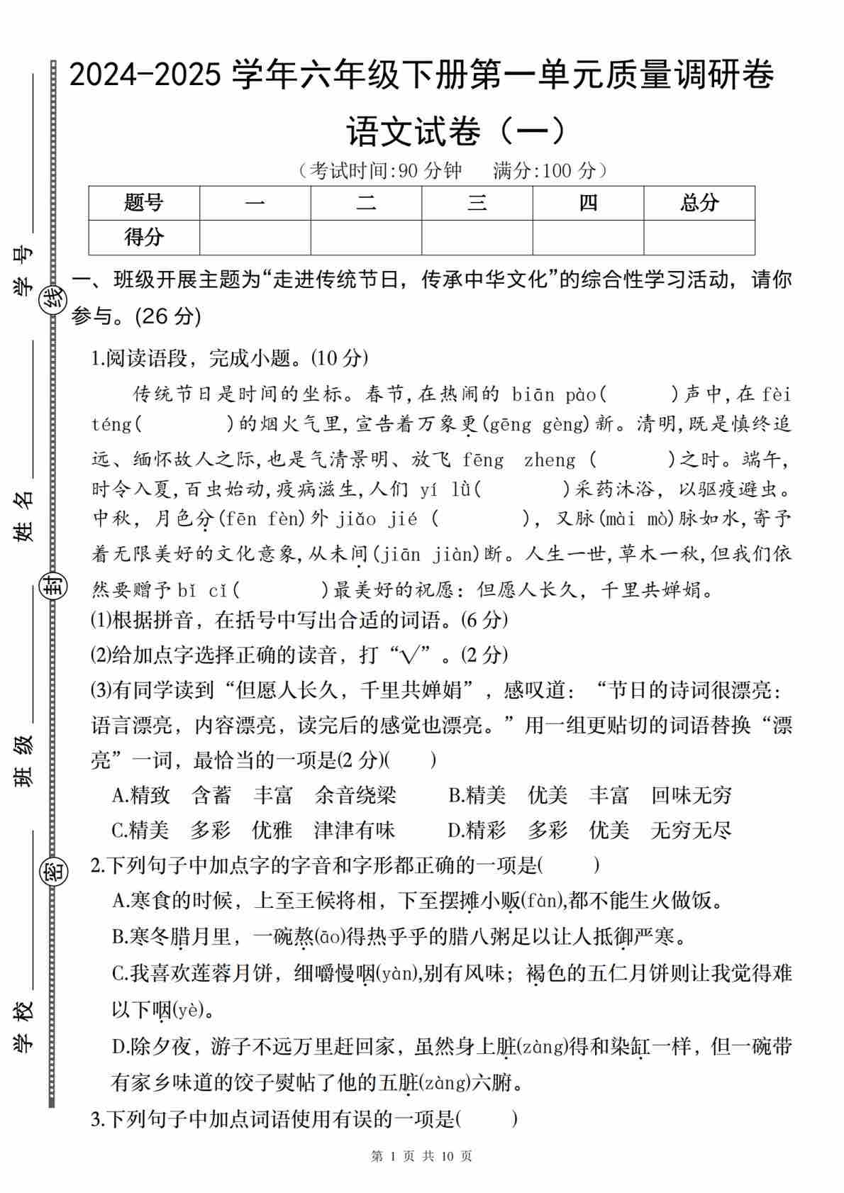 【2024-2025学年第一单元质量调研卷(一)】六下语文