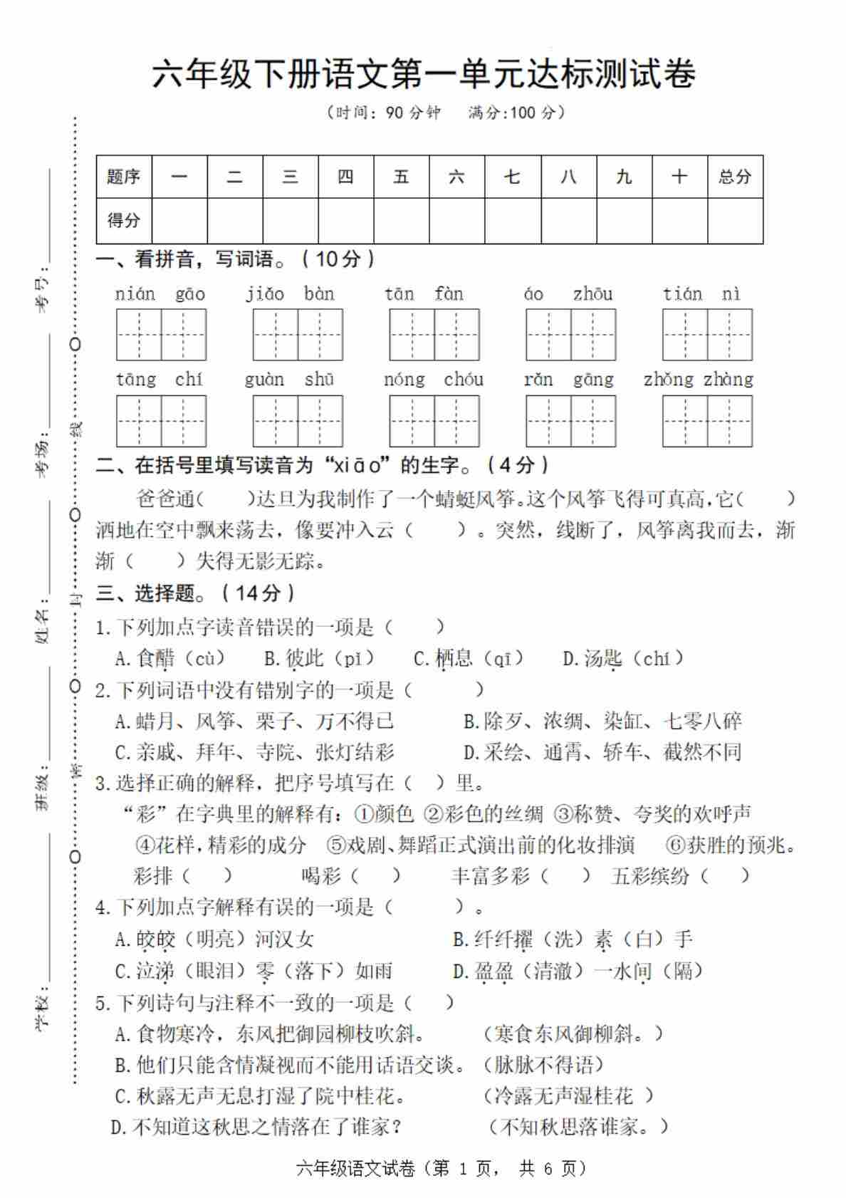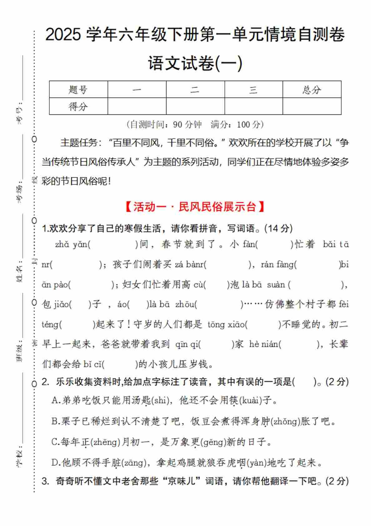 【2025学年第一单元情境自测试卷(一)】六下语文