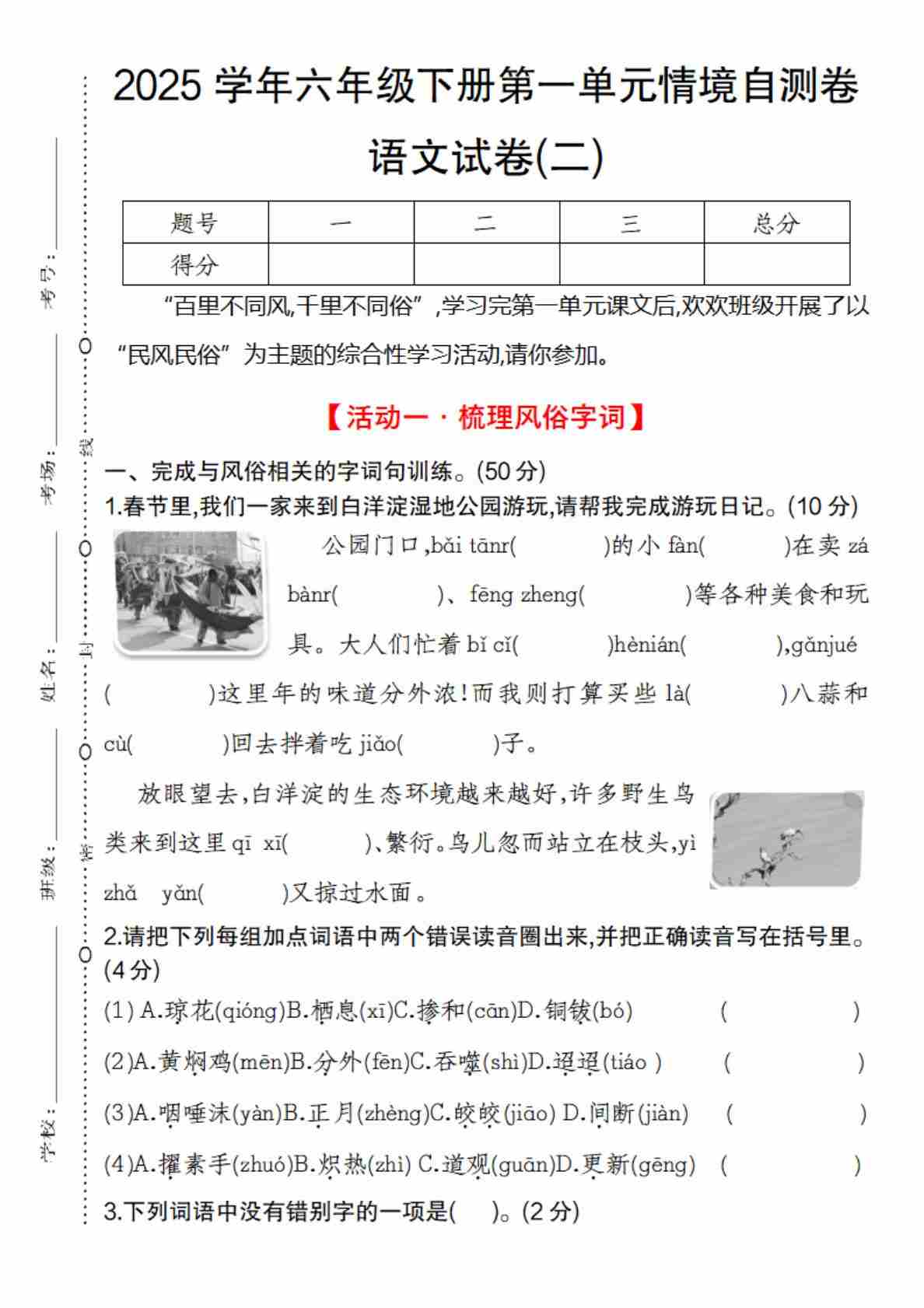 【2025学年第一单元情境自测试卷(二)】六下语文