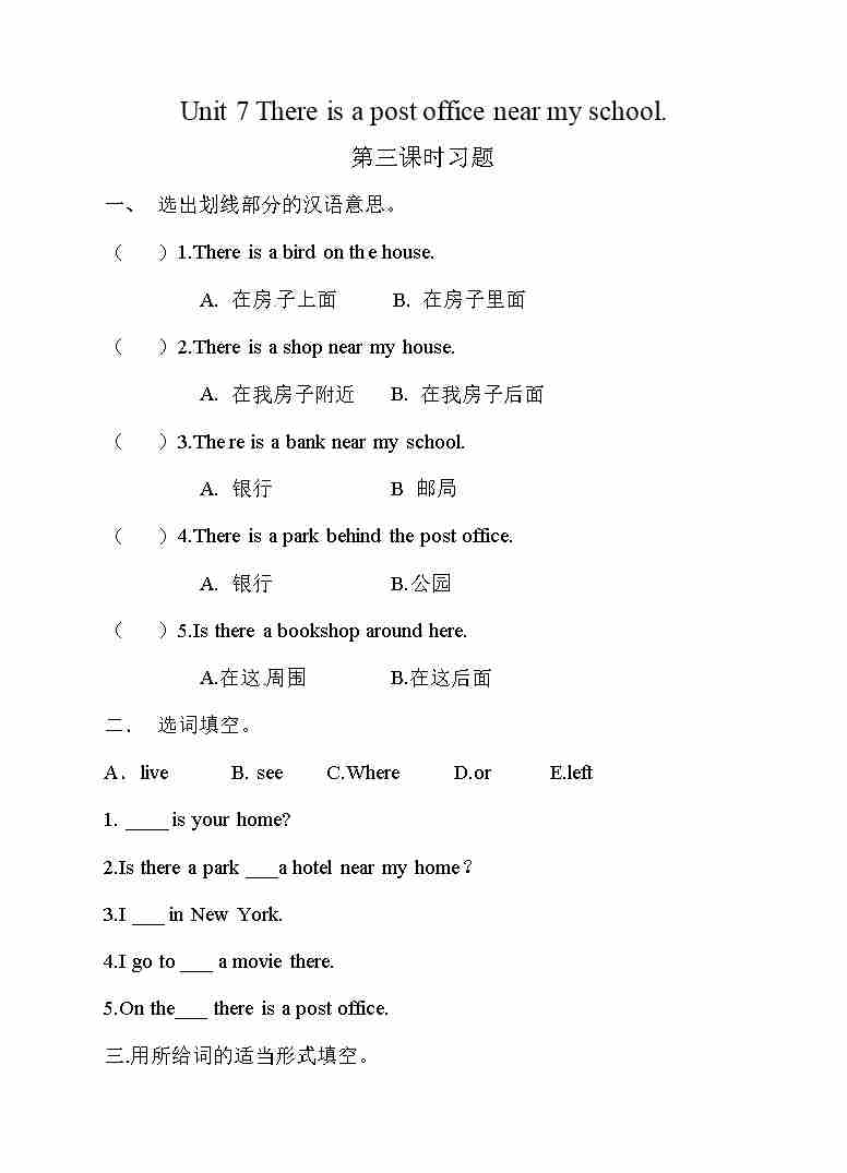 五年级下册英语一课一练-Unit 7 There is a post office near my school 第三课时 湘少版三起(word版,含答案)