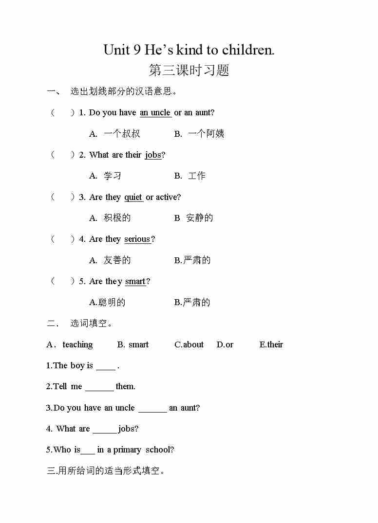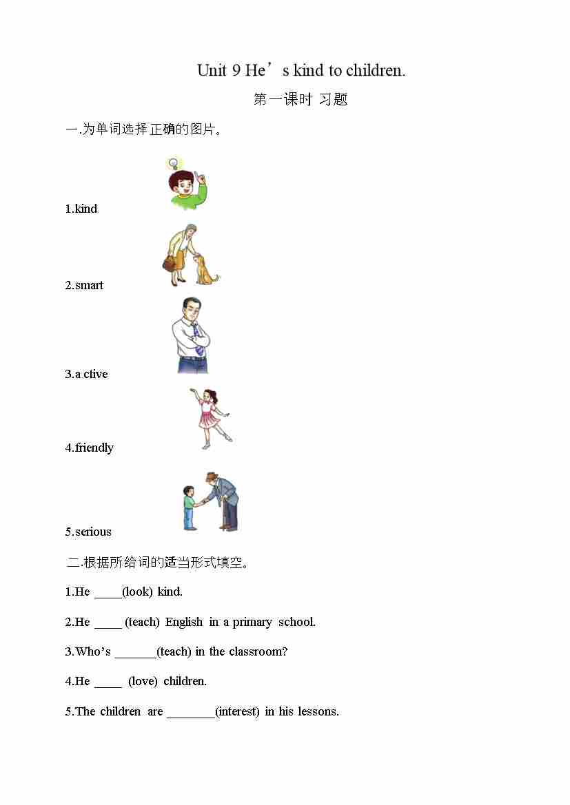 五年级下册英语一课一练-Unit 9 He's kind to children 第一课时 湘少版三起(word版,含答案)