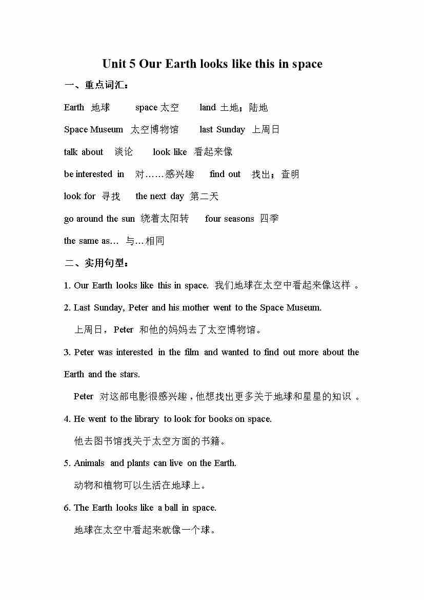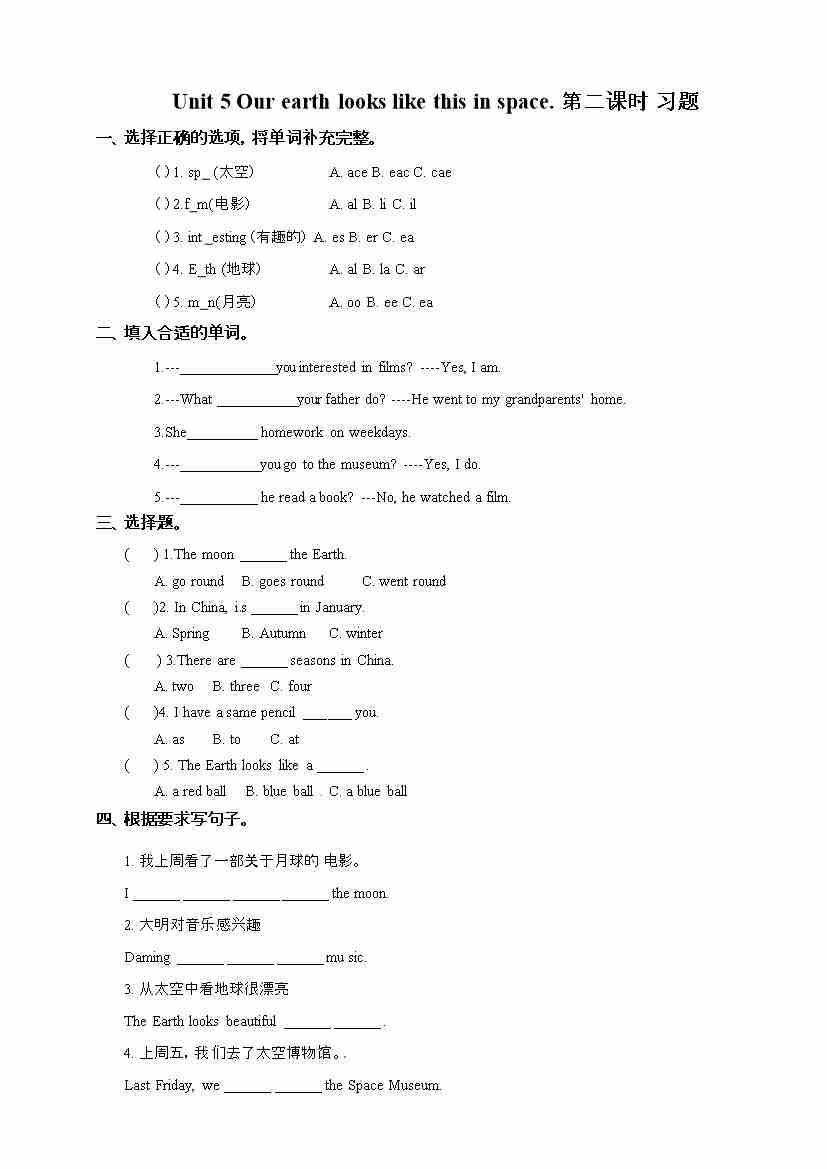 六年级下册英语一课一练-Unit 5 Our earth looks like this in space 第二课时 湘少版(三起) (word版,含答案)