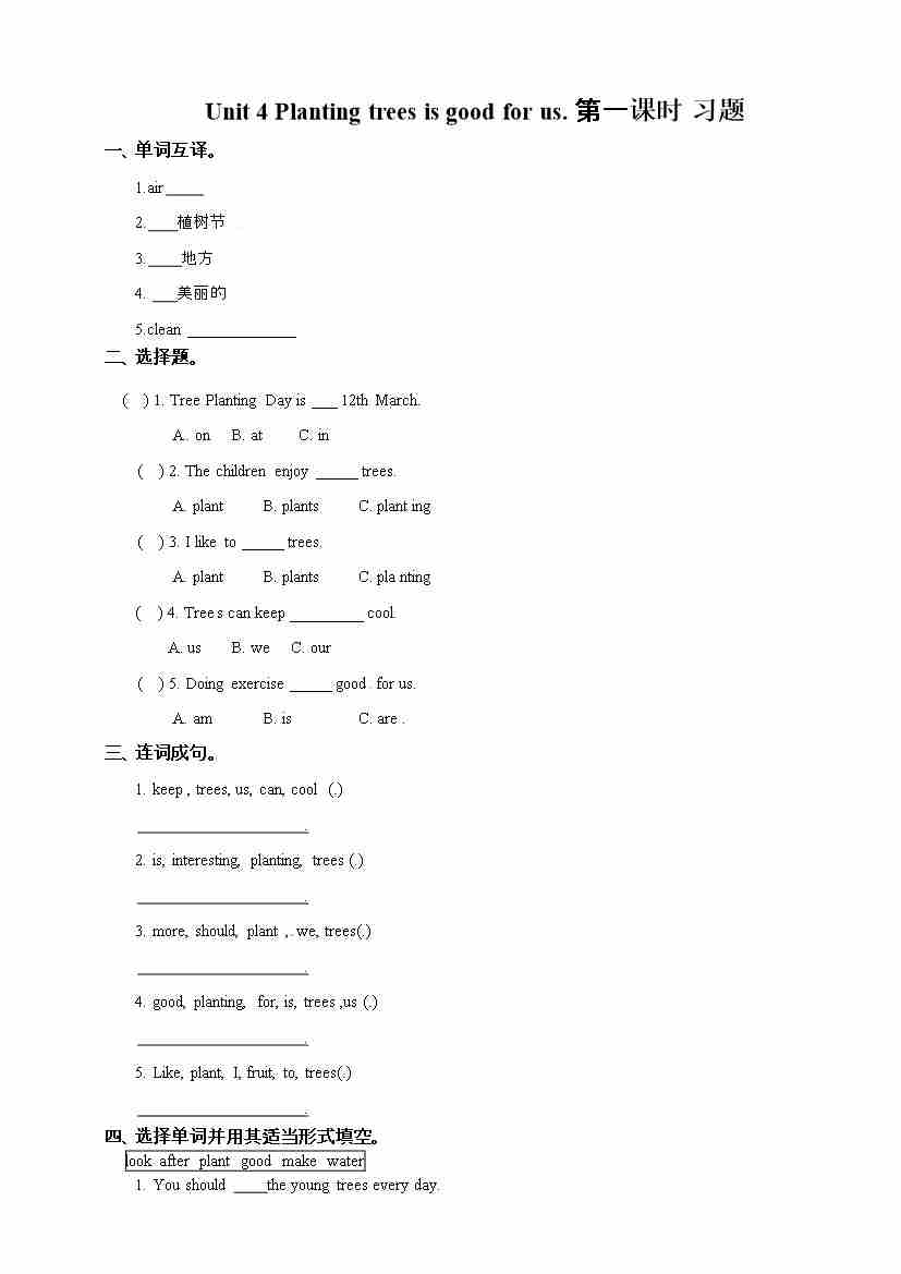 六年级下册英语一课一练-Unit 4 Planting trees is good for us 第一课时 湘少版(三起) (word版,含答案)