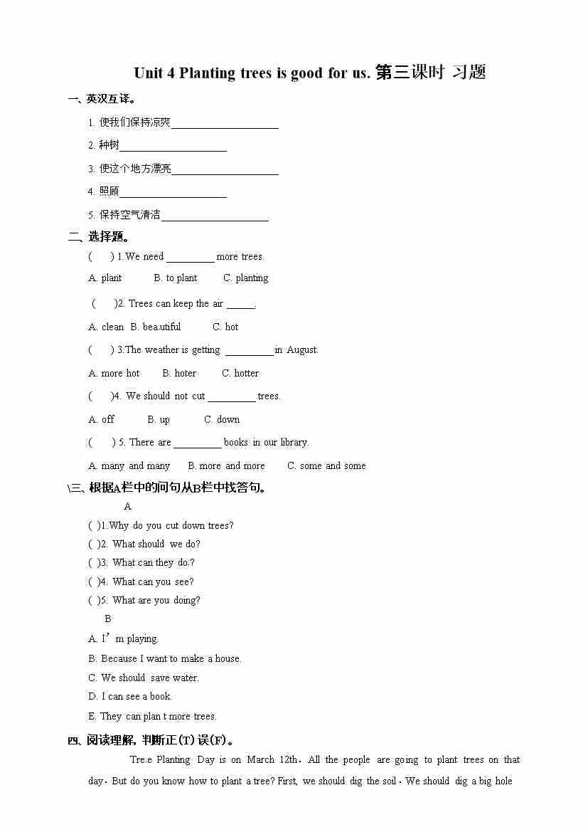 六年级下册英语一课一练-Unit 4 Planting trees is good for us 第三课时 湘少版(三起) (word版,含答案)