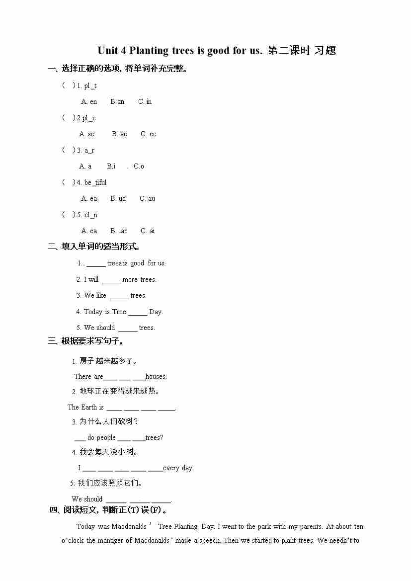 六年级下册英语一课一练-Unit 4 Planting trees is good for us 第二课时 湘少版(三起) (word版,含答案)