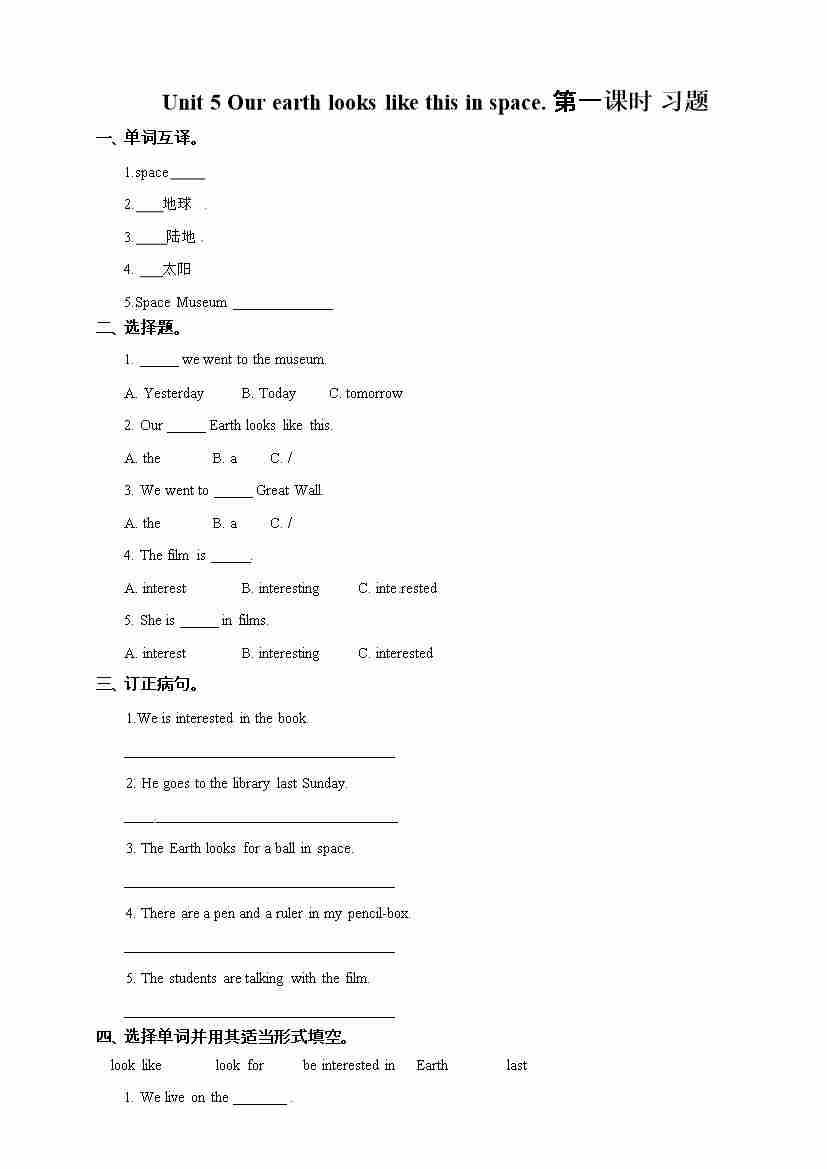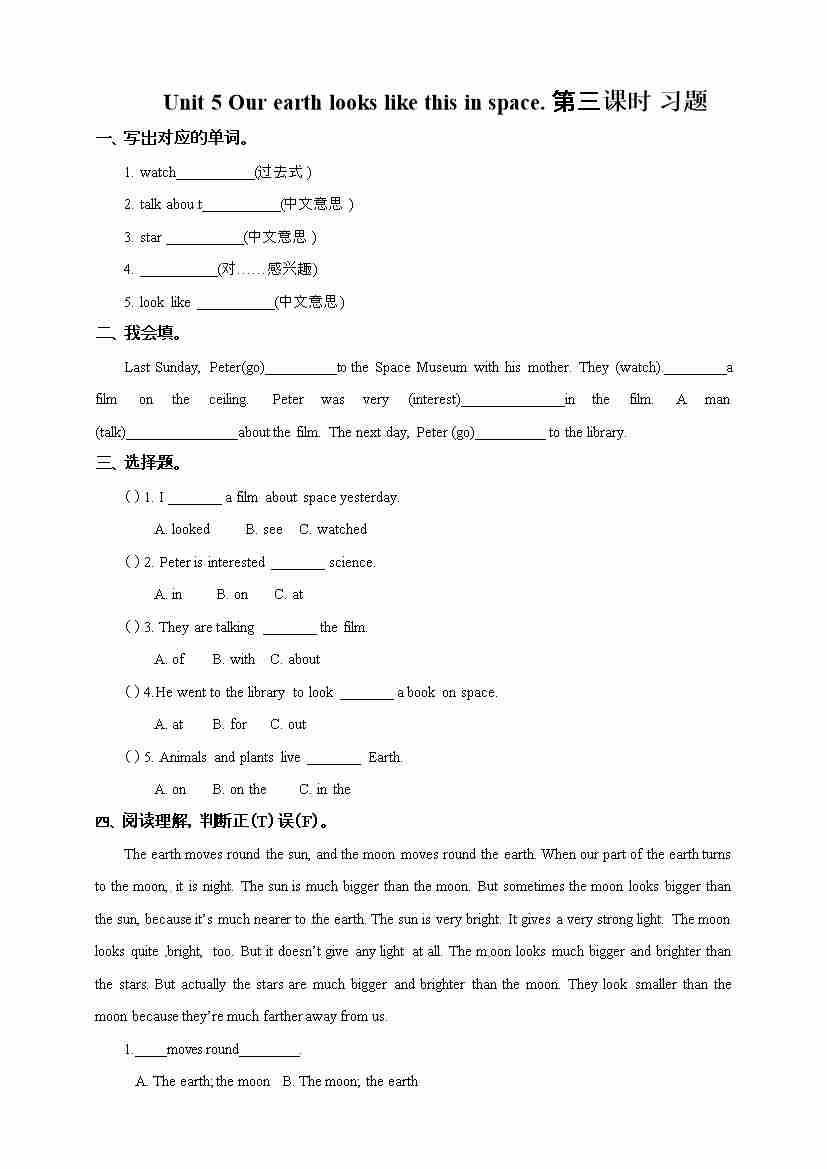 六年级下册英语一课一练-Unit 5 Our earth looks like this in space第三课时 湘少版(三起) (word版,含答案)