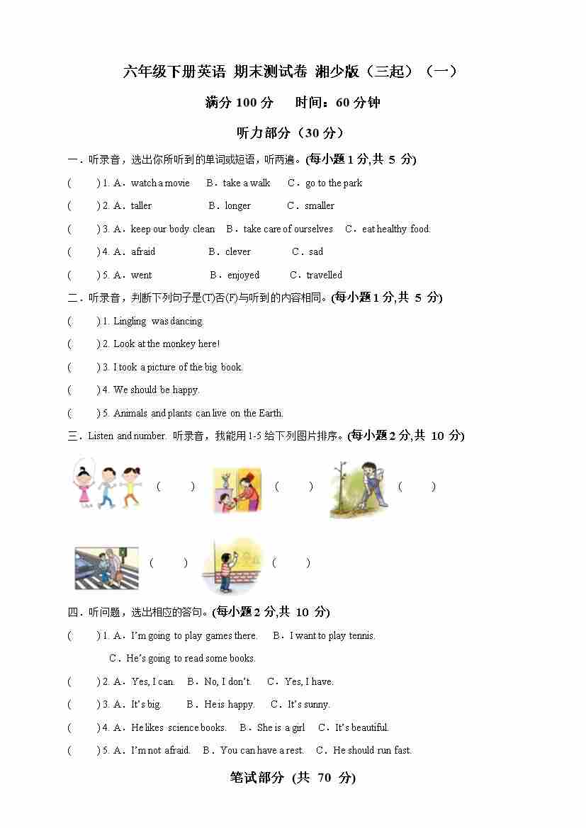 期末测试卷 湘少版(三起)(一)