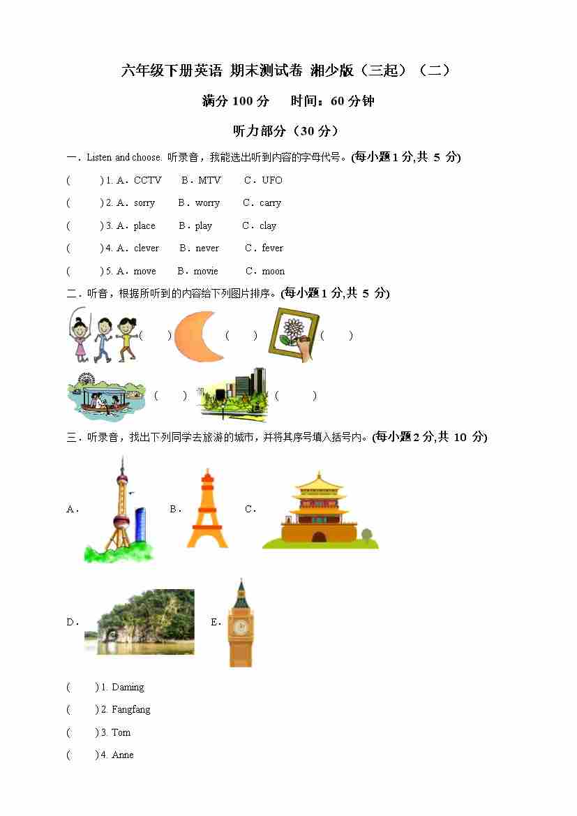 期末测试卷 湘少版(三起)听力音频