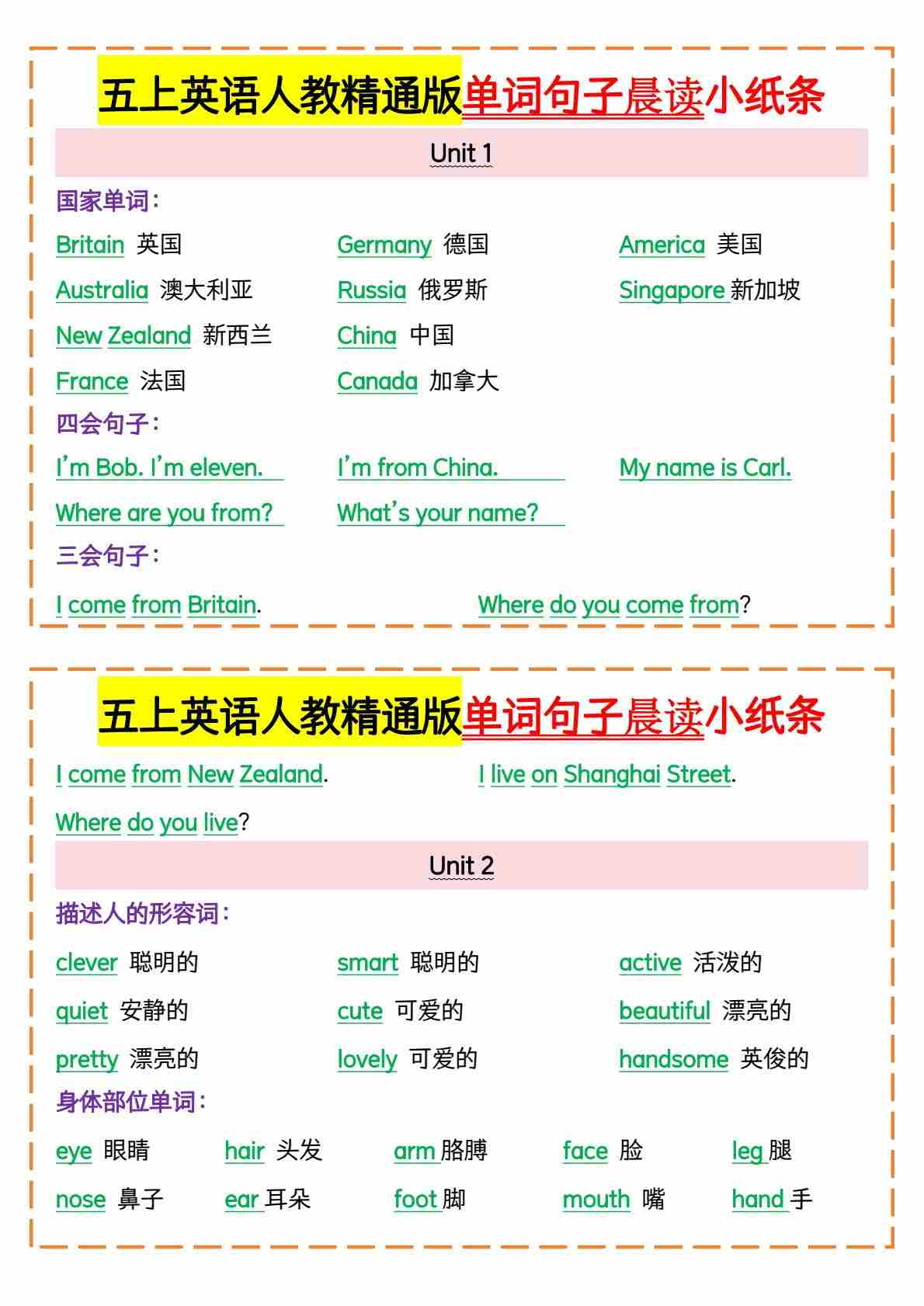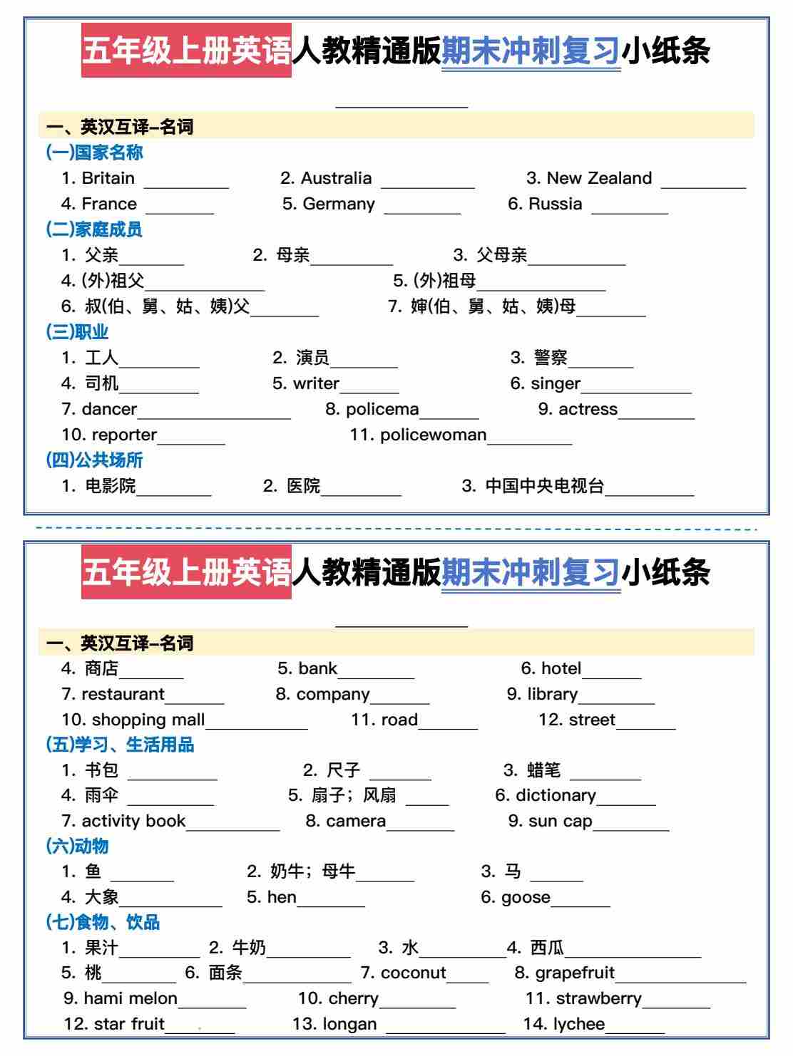 五上英语重点词汇精通版期末冲刺复习小纸条