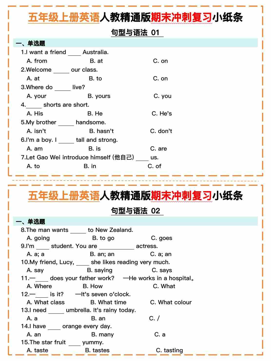 五上英语句型与语法精通版期末冲刺复习小纸条1