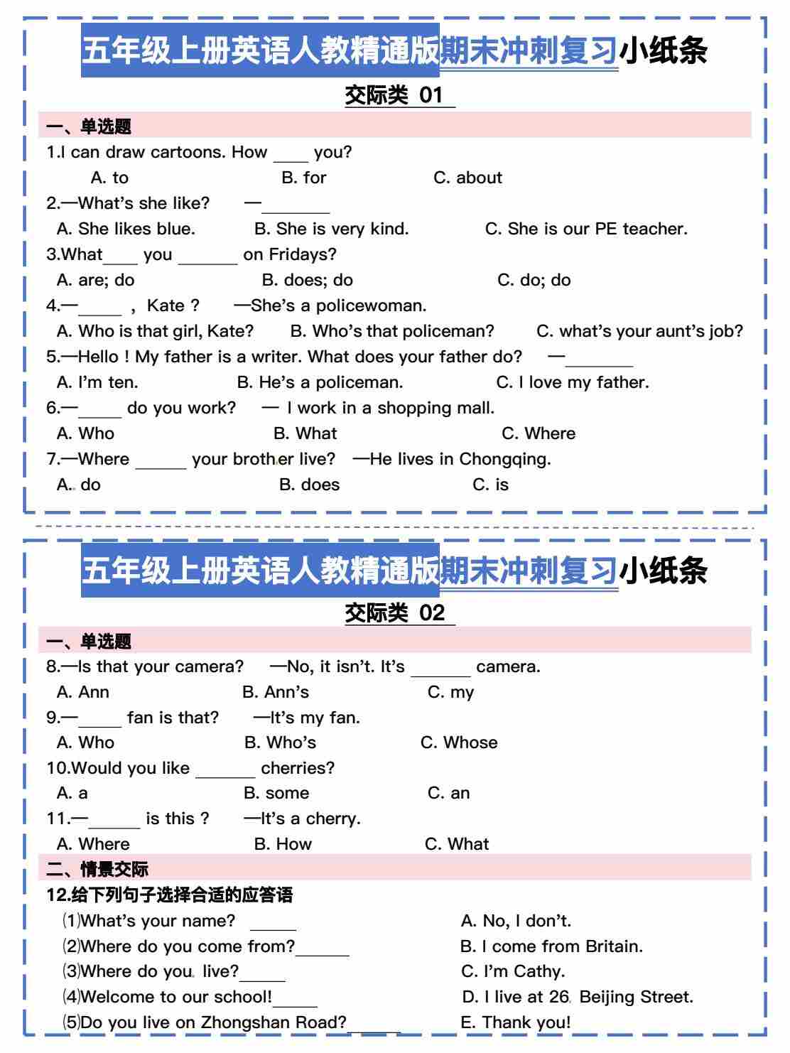 五上英语句型与语法精通版期末冲刺复习小纸条2