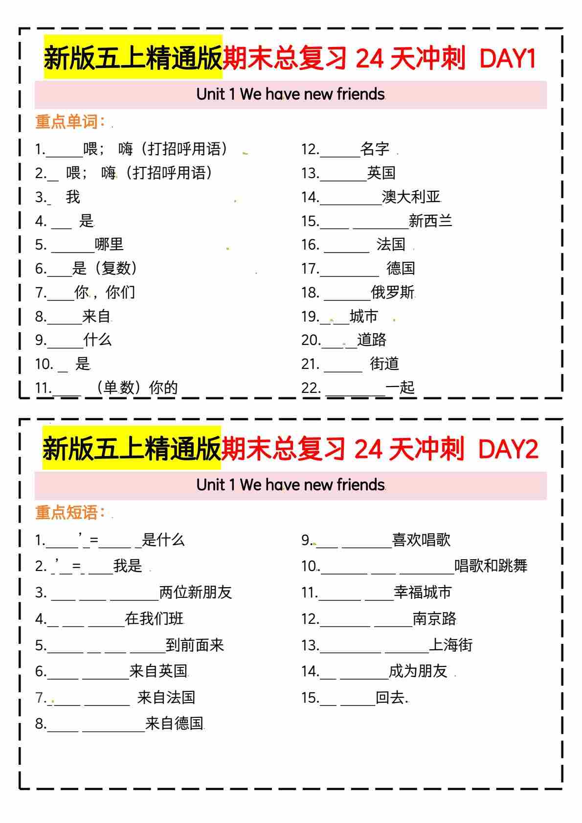 【挖空式】五年级上册 单元知识背诵清单-Unit 1 We have new friends 人教精通版 (三起)含答案
