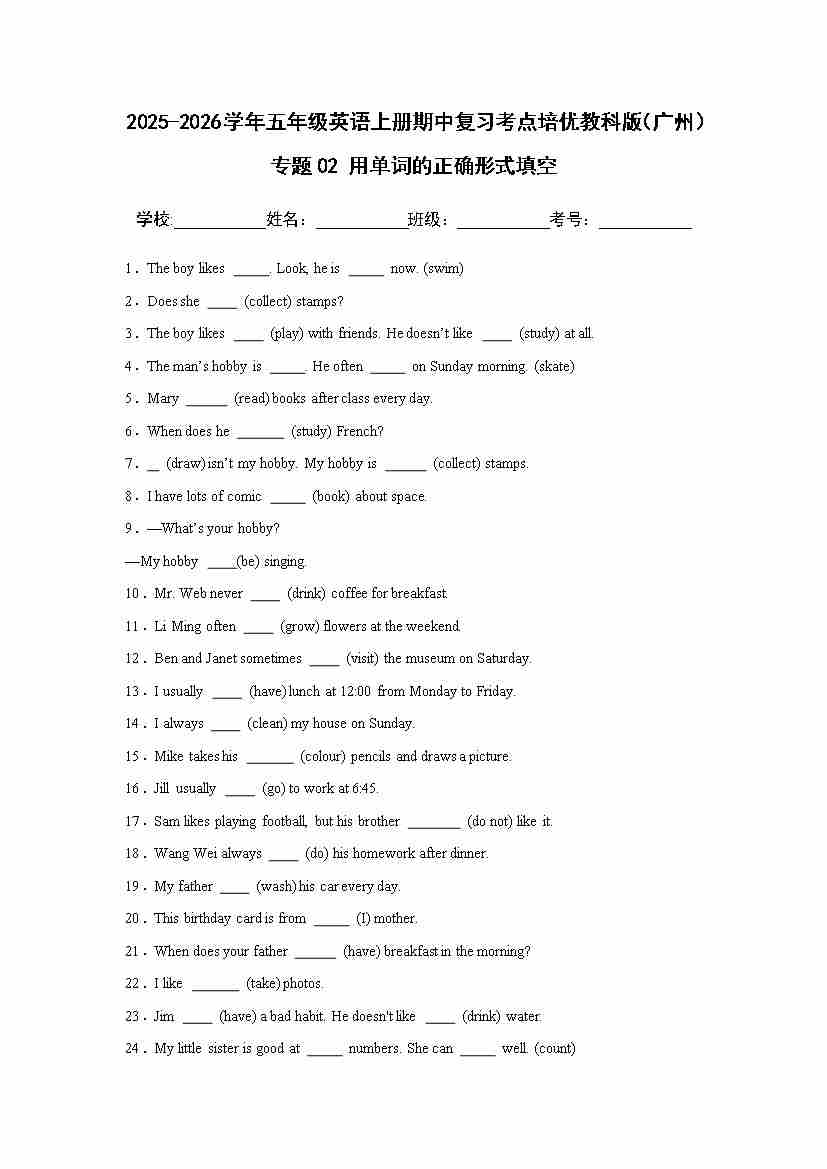 专题02 用单词的正确形式填空-2025-2026学年五年级英语上册期中复习考点培优教科版(广州)(含答案解析)